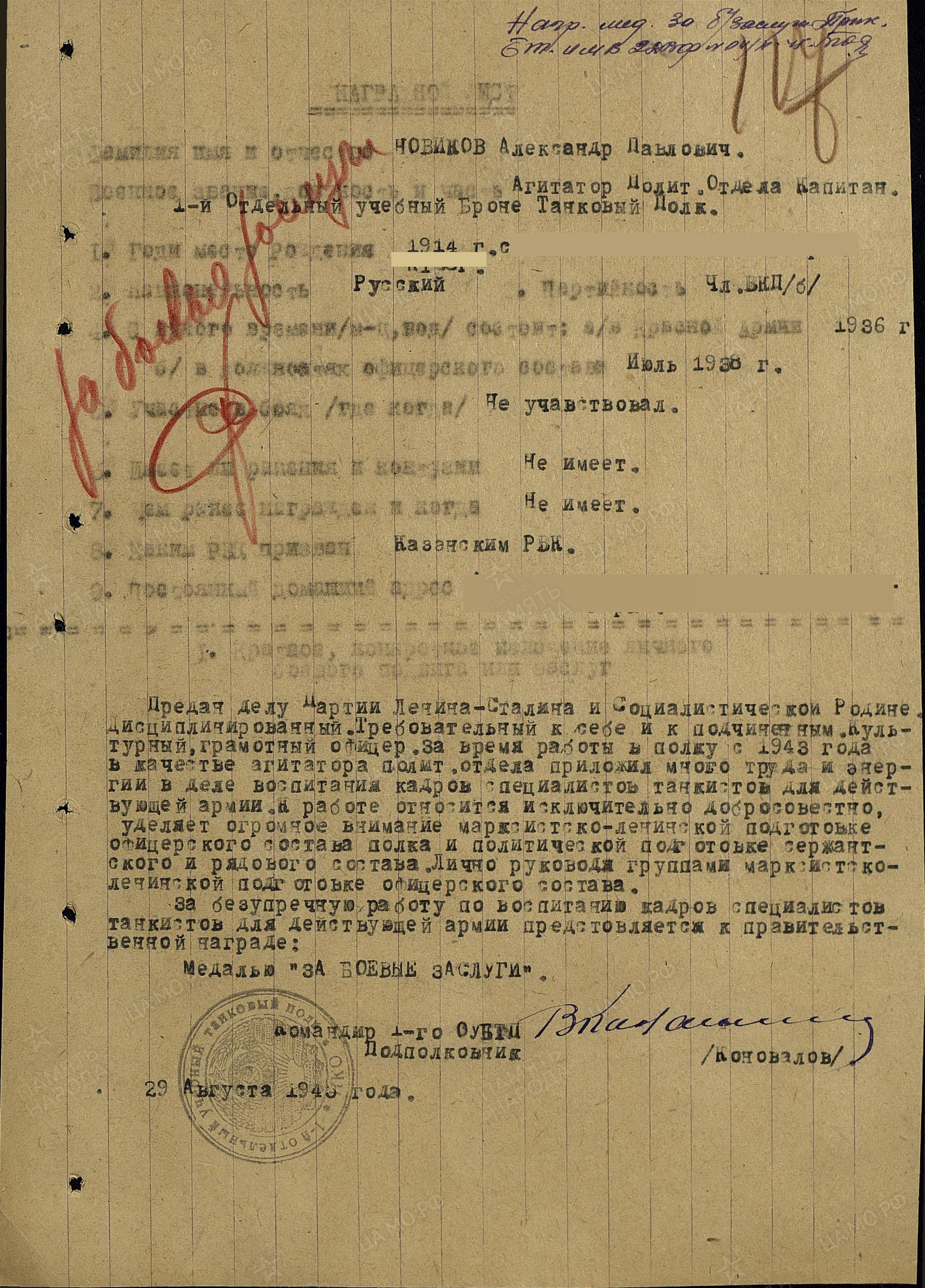 НОВИКОВ Александр Павлович, 1914, с. Масловка. Мобилизован Казанским ГВК в 1936. Член ВКП(б). С 1943 - капитан, агитатор политотдела 1 отд. учебного танкового полка 2 Дальневосточного фронта. Участвовал в войне с Японией. Награждён медалью "За боевые заслуги". В отставку вышел в звании подполковника.