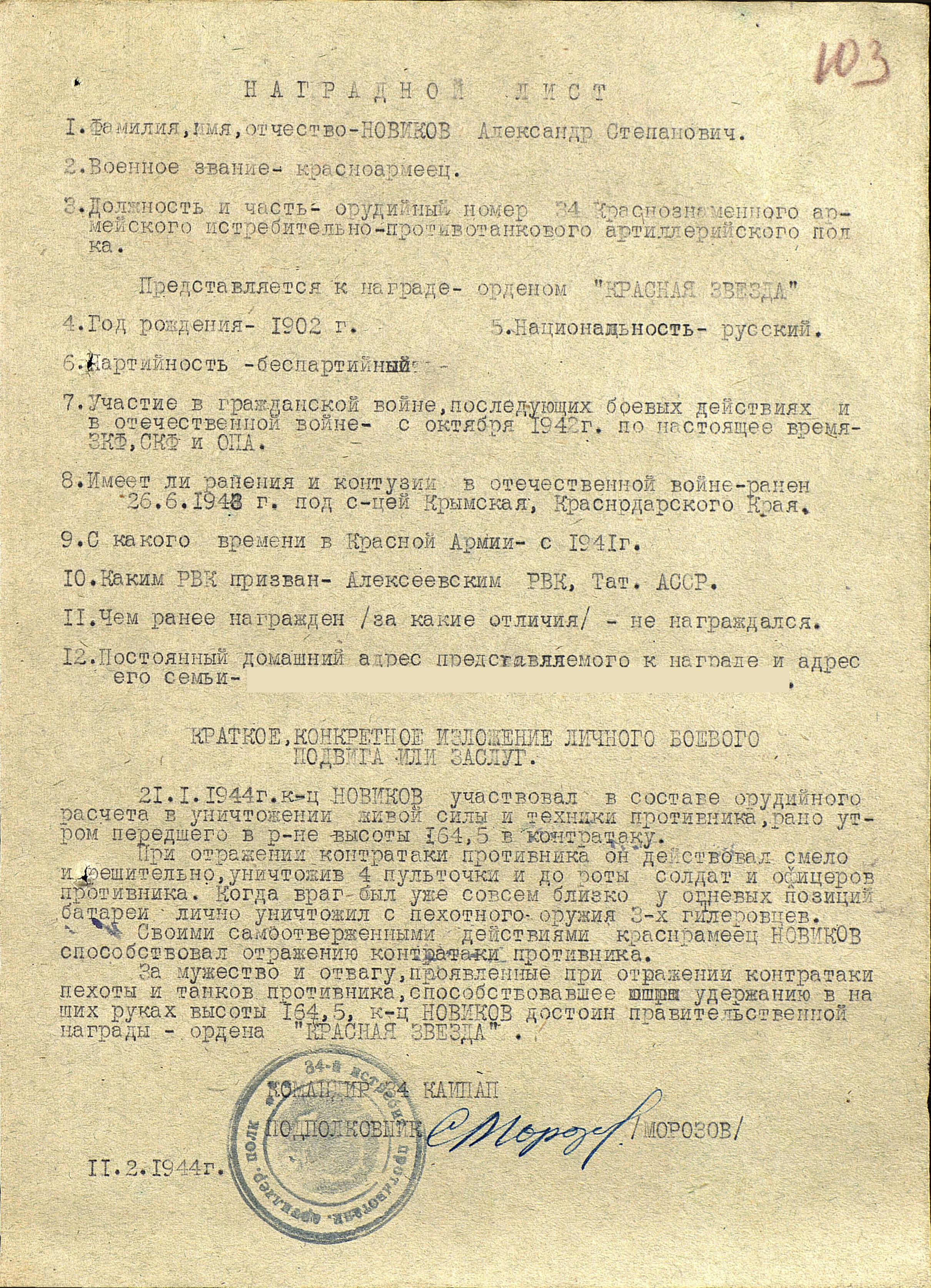 НОВИКОВ Александр Степанович, 1902, с. Алексеевское. Мобилизован в РККА в 1941 г. Алексеевским РВК. Красноармеец (мл. сержант), орудийный номер, связист 34 армейского истребительно-противотанкового артиллерийского полка. Воевал на Северо-Кавказском фронте, в Отдельно Приморской Армии. В 1943 г. был ранен (июль месяц, станица Крымская, Краснодарский Край). В декабре 1943 г., будучи поваром 3 батареи полка, в боях за освобождение низовьев Кубани, Таманского полуострова и Аджи-Мушкая проявил мужество и исключительно добросовестное отношение к обеспечению бойцов своего подразделения на передовой горячим питанием и был награждён первой медалью "За боевые заслуги". В феврале 1944 г., как участник удержания высоты 164,5 (Крым) был представлен к ордену Красная Звезда, но получил только медаль "За боевые заслуги" (вторую). Также награждён медалями "За оборону Кавказа", "За победу над Германией", орденом Отечественной войны 2 ст. (1985). После войны работал шорником. Скончался в 1991 г., похоронен в с. Алексеевское.
