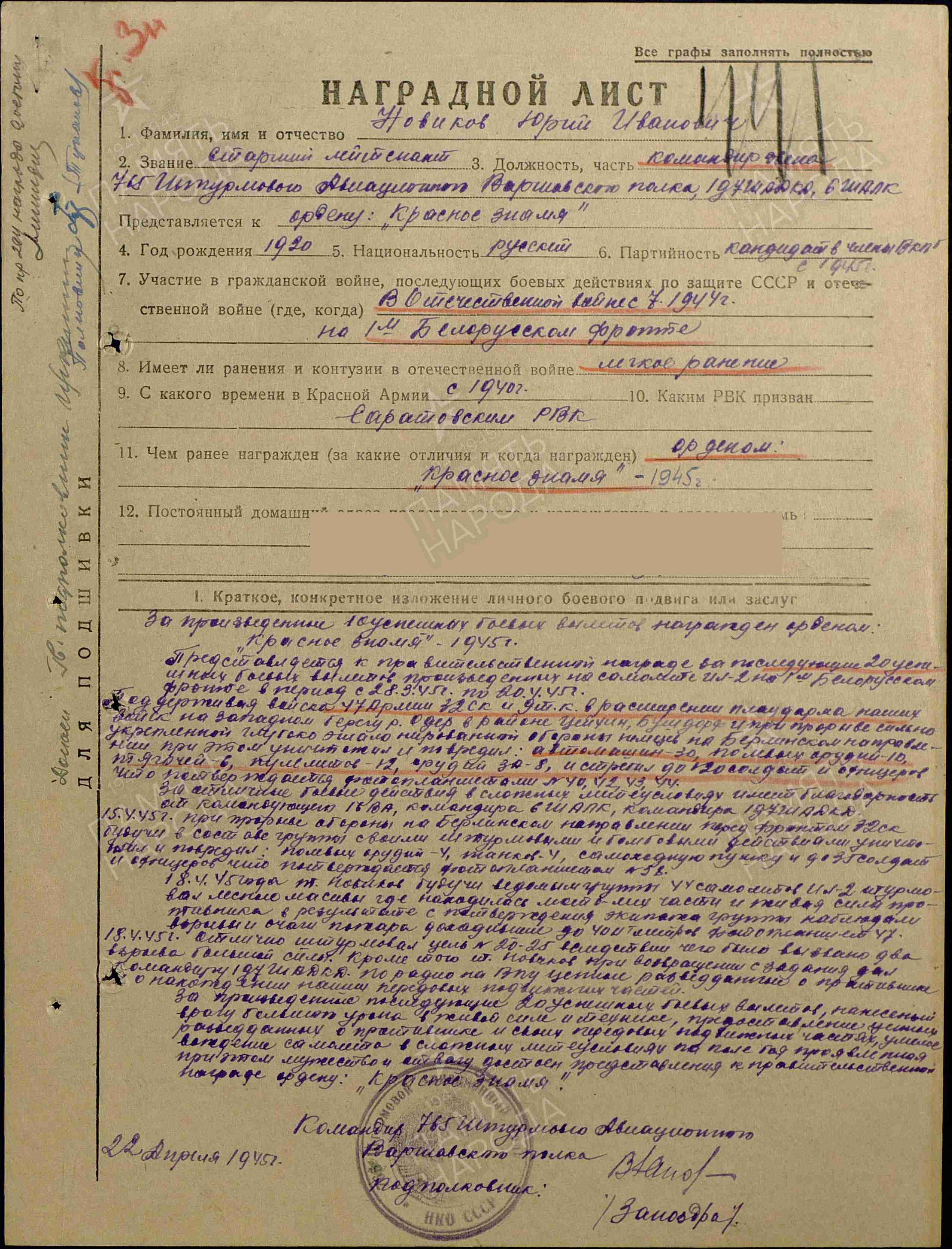 НОВИКОВ Юрий Иванович, 1920, с. Алексеевское. Мобилизован Саратовским ГВК 12 авг. 1940. Проходил кадровую авиа подготовку с 1940 по 1944. Член ВЛКСМ. Лейтенант/ ст. лейтенант, пилот самолёта Ил-2, ком. авиазвена 765 ШАП 197 ШАД 6 ШАК 6 ВА/ 16 ВА/ 11 ВА. В боевых вылетах с 10 июля 1944, 1 БелФ. Совершил 34 успешных боевых вылетов в целях воздушной поддержки войск 47 А/ 8 гв. А/ 5 УдА и др., воздушной разведки и уничтожения наземных сил противника в боях на территории Польши и Германии. Награждён двумя орденами Красного Знамени, медалями «За освобождение Варшавы», «За взятие Берлина». Вышел в отставку 15 авг. 1953.