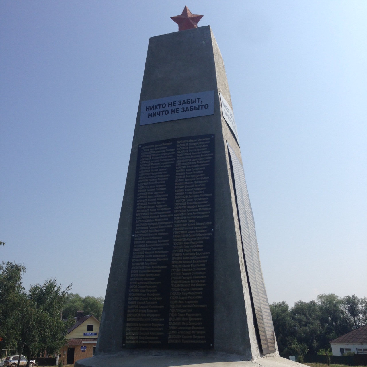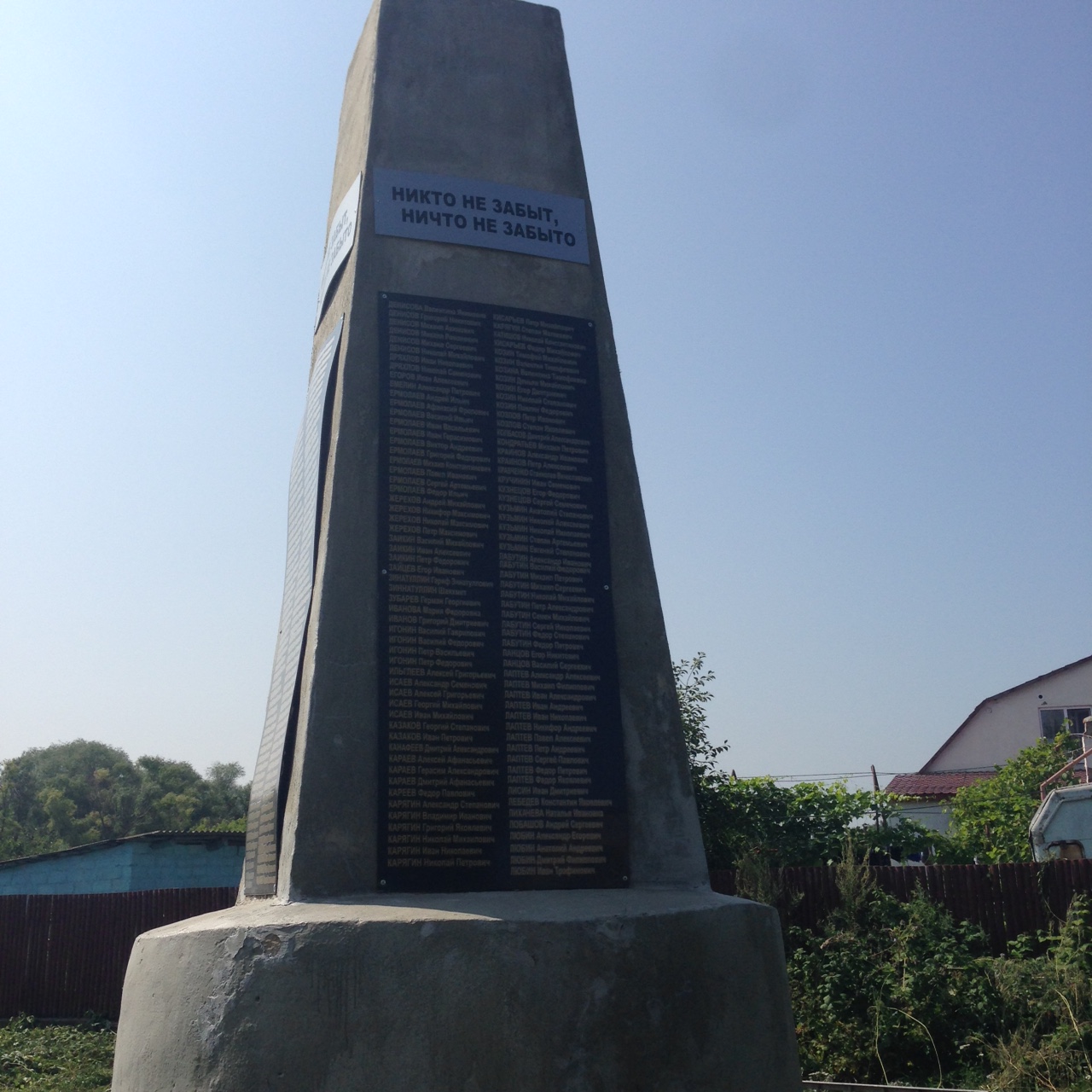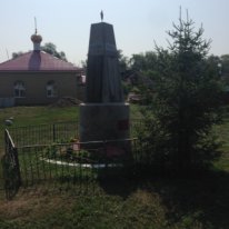 Обелиск из бетона 4 гранный высотой - 5 м., с шириной сторон - 1м., с круглым основанием, увенчанная пятиконечной звездой, на всех четырех сторонах размещены плиты с фамилиями погибших и умерших воинов.