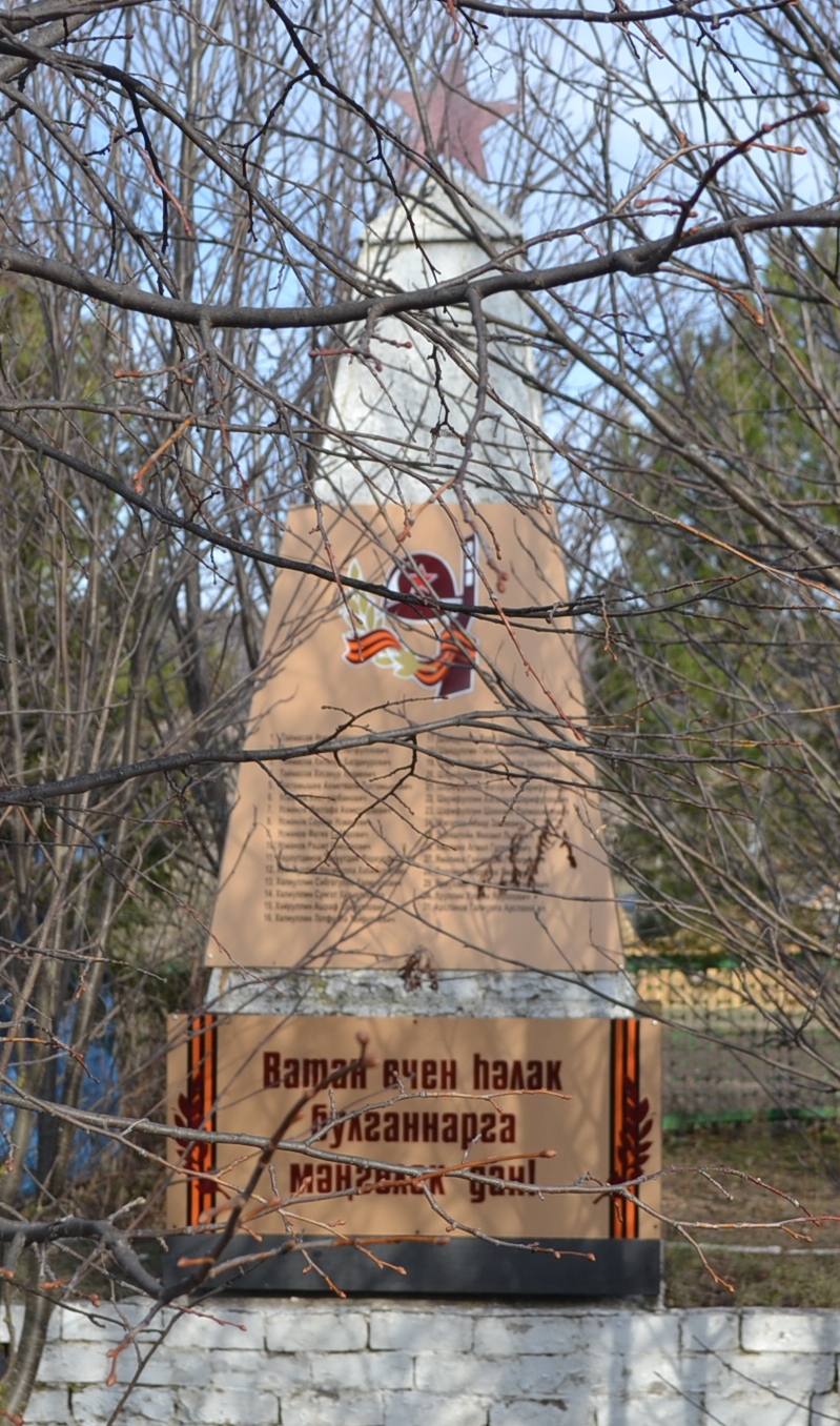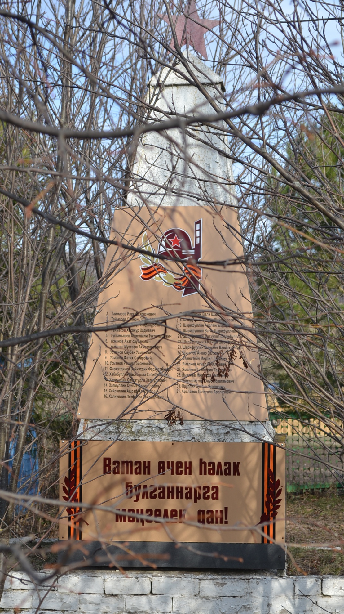 Обелиск находятся на территории сельской мечети, установлены набдись "Ватан очен хелак булганнарга мэнгелек дан!", на верхушке пятиконечная звезда. Материал объекта - железо, основание красный кирпич, зеленые насаждения. Датировка объекта 1997 год.