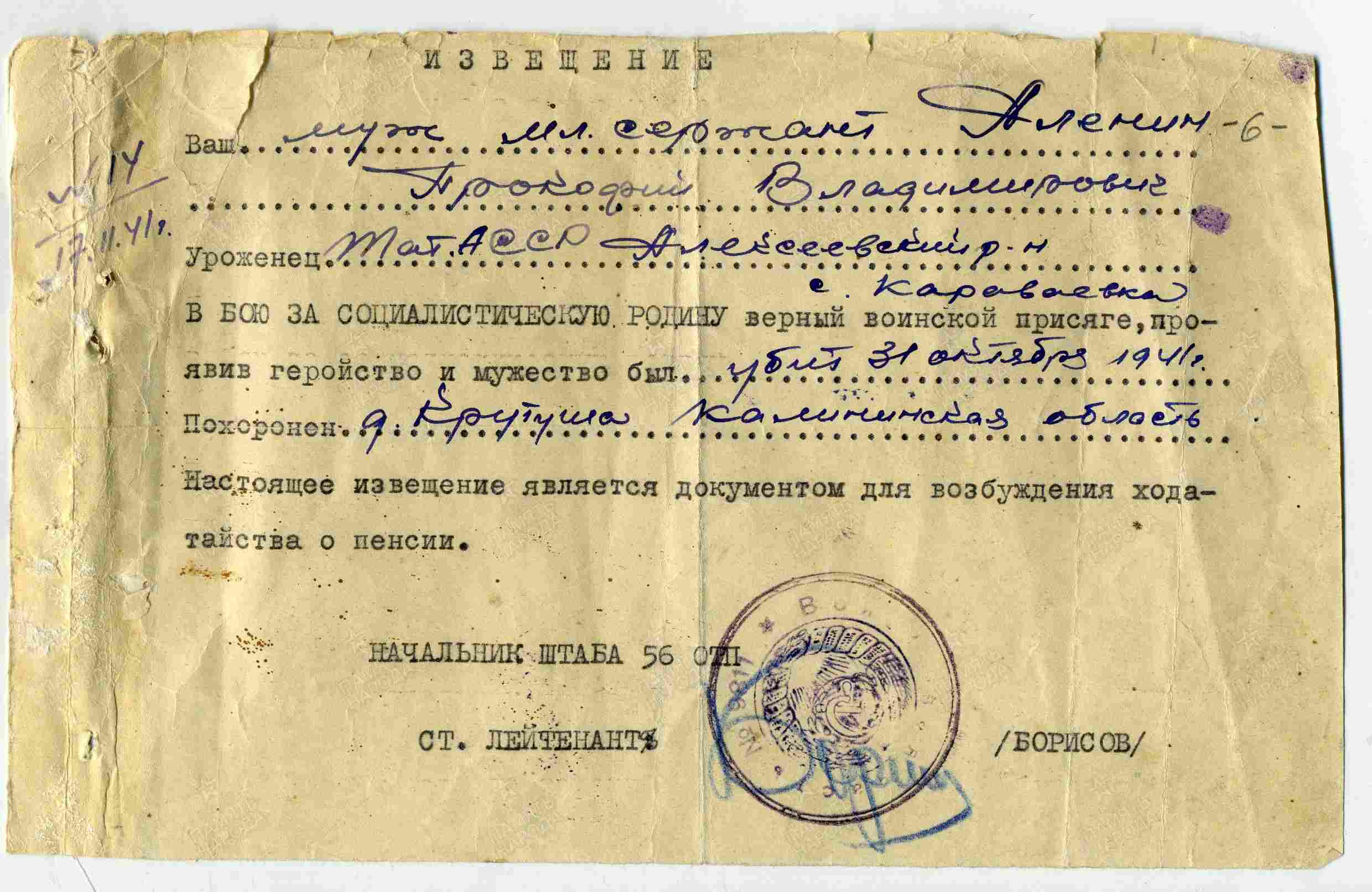 ОЛЕНИН Прокофий Владимирович, 1911, с. Караваево. Моб. Москворецким РВК г. Москва. Командир отделения 56 ТП 28 ТД (214 СД) 12 МК Северо-Западного фронта. Погиб 31 окт. 1941, д. Крутуша, Демянский р-н, Новгородская обл.