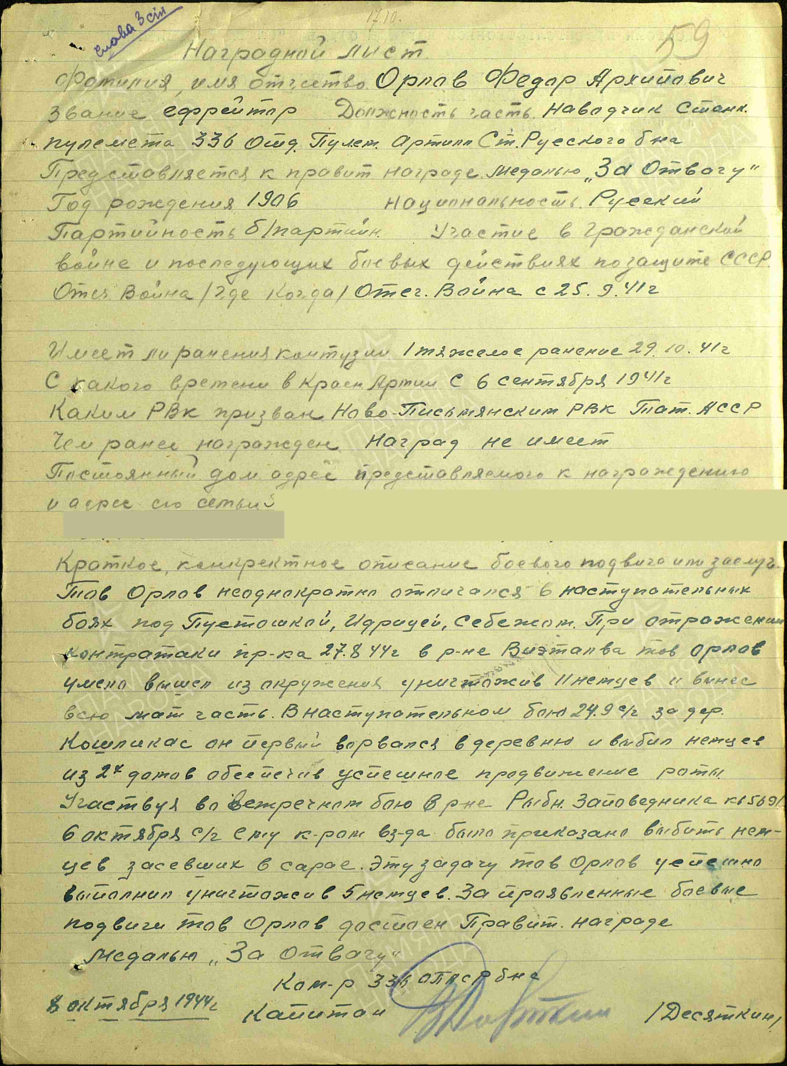 «Орлов Федор Архипович, 1906 года рождения. Мой дед. Место рождения: д. Аксаково, Самарской области, Челно-Вершинский район. Дата поступления на службу: 06.09.1941. Место призыва: Ново-Письмянский РВК, Письмянского района Татарской АССР. Место службы: 192 гв. сп. 63 гв. сд. В октябре 1941 г. был ранен, не смотря на это прошел всю войну. За проявленную отвагу был представлен к наградам: Медаль за отвагу, Орден Славы lll степени, Медаль за Оборону Ленинграда.»