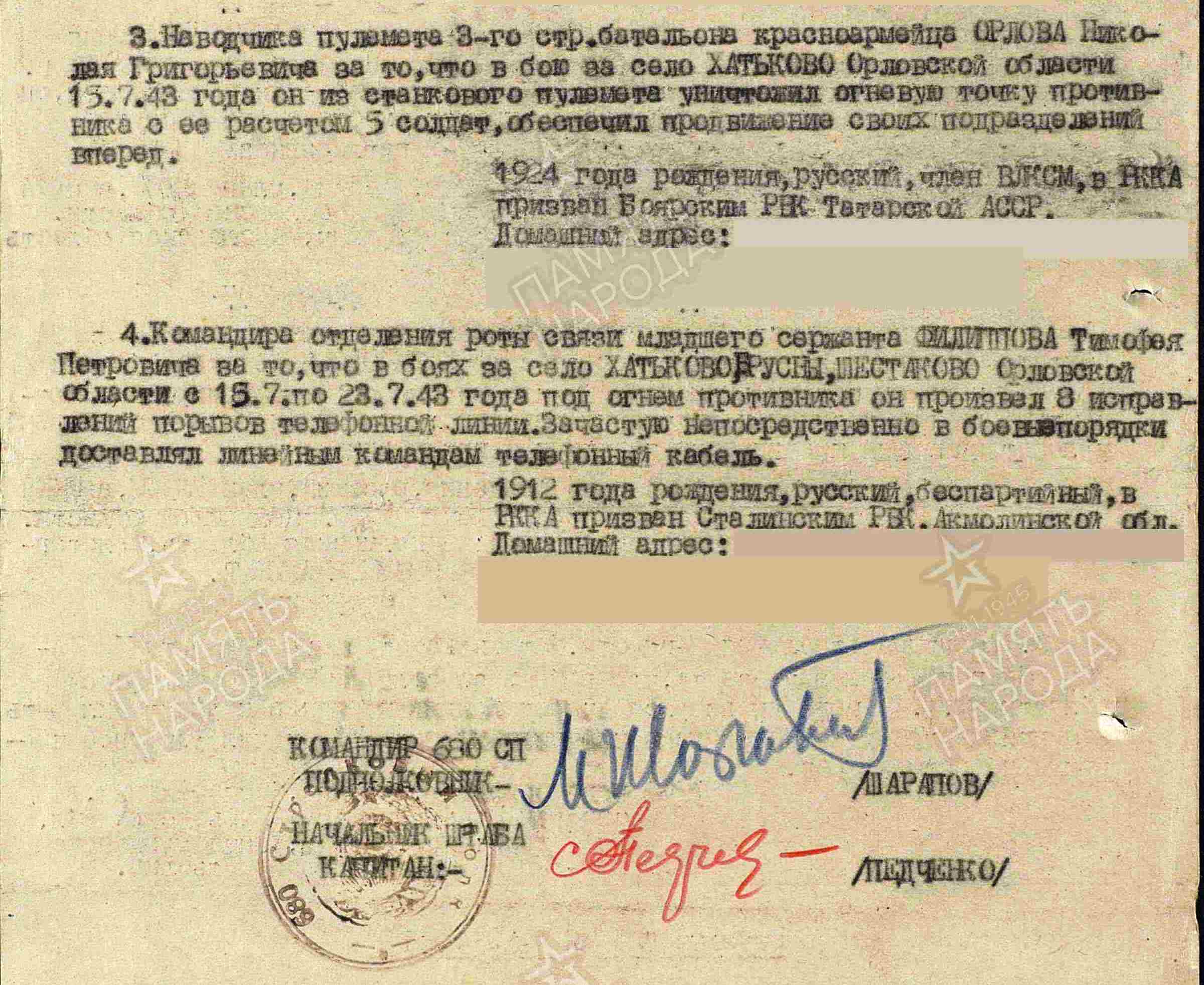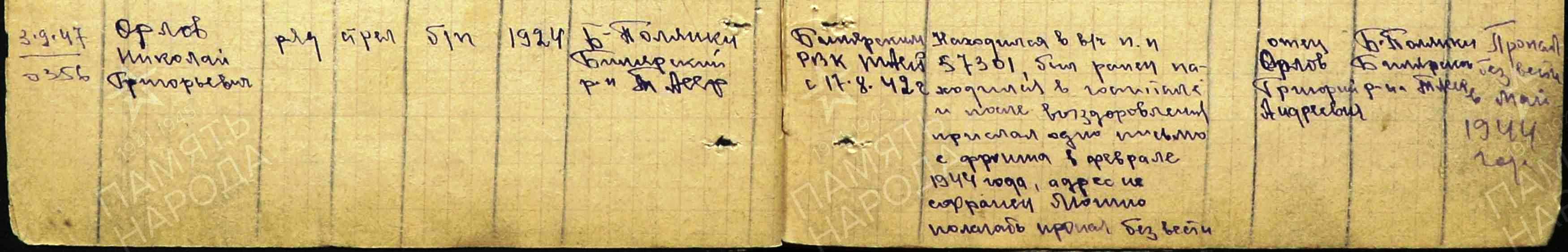 ОРЛОВ Николай Григорьевич, 1924, с. Большие Полянки. До призыва в армию работал в к-зе «Большие Полянки». Член ВЛКСМ. Мобилизован 23 авг. 1942 Билярским РВК. Красноармеец, наводчик пулемёта 680 СП 169 СД 11 гв. А Западного/ Брянского фронта. Участник битвы на Курской дуге. Отличился 15 июля 1943 в бою за д. Хотьково, Орловская обл. – огнём станкового пулемёта уничтожил огневую точку противника с пятью солдатами, обеспечил продвижение своих подразделений вперёд. Награждён медалью «За боевые заслуги». По отчёту о потерях полка - погиб 5 авг. 1943, с. Ильинское, Хотынецкий р-н, Орловская обл. Увековечен на братском захоронении в д. Студёнка. По сведениям родителей – перенёс ранение и находился на излечении в госпитале. После выздоровления в фев. 1944 пришло одно письмо, после чего письменная связь прекратилась. Учтён военкоматом пропавшим без вести.