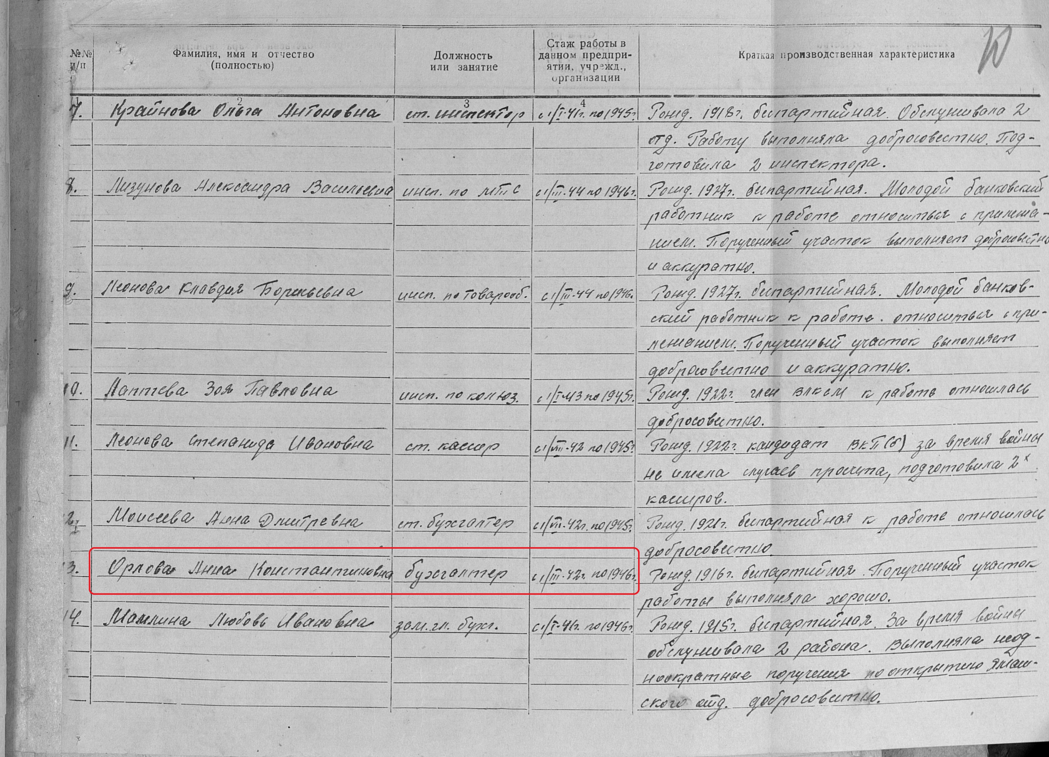 Орлова Анна Константиновна родилась 1916 году. Место жительства: с.Новошешминск Ново-Шешминский район ТАССР. В годы Великой Отечественной войны работала в Отделении Государственного банка бухгалтером. Награждена медалью "За доблестный труд в Великой Отечественной войне 1941–1945 гг." (Акт от 01.1946 г., фонд 3610, опись 2, дело № 174, лист 10). Похоронена на сельском кладбище с.Новошешминск.