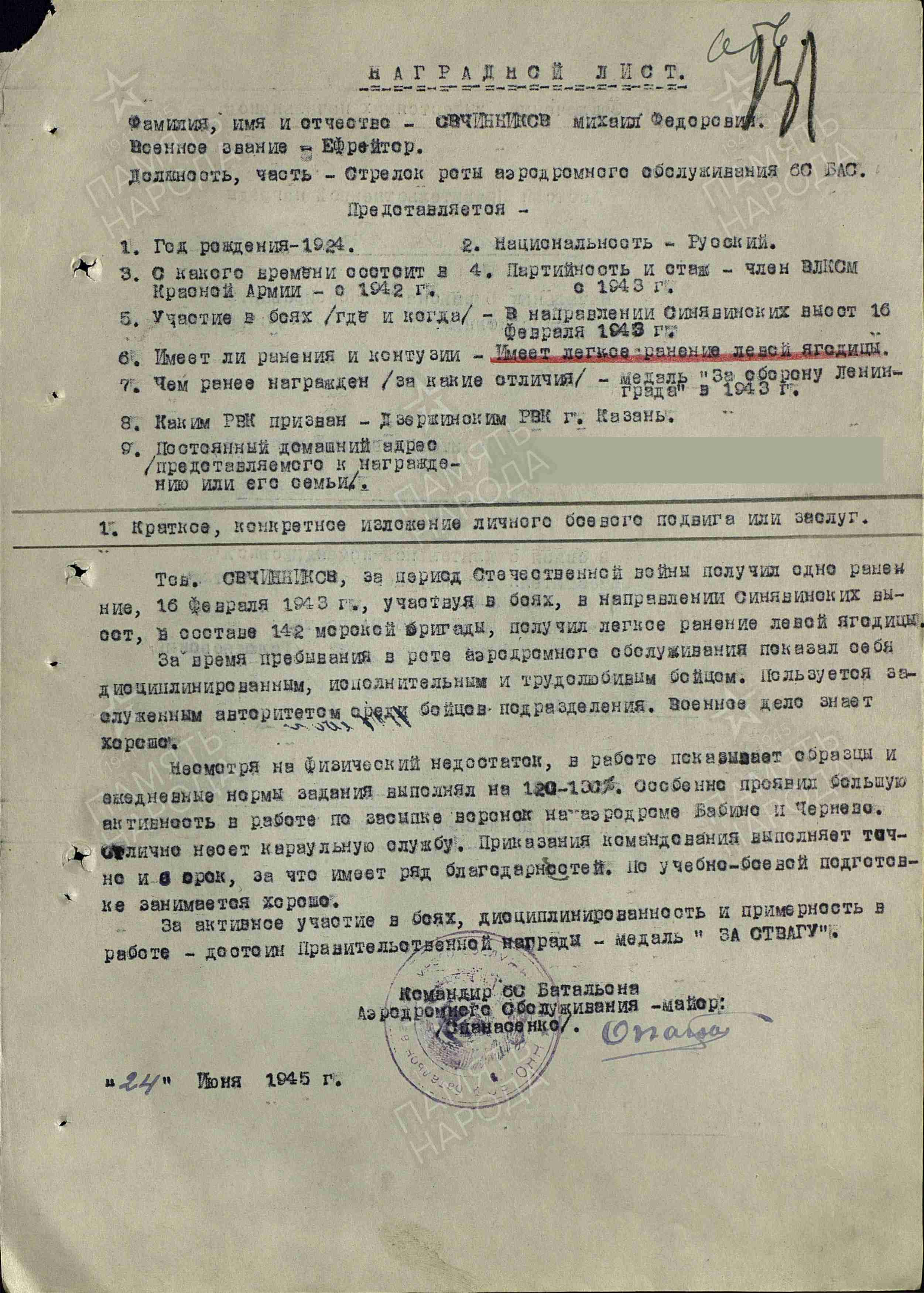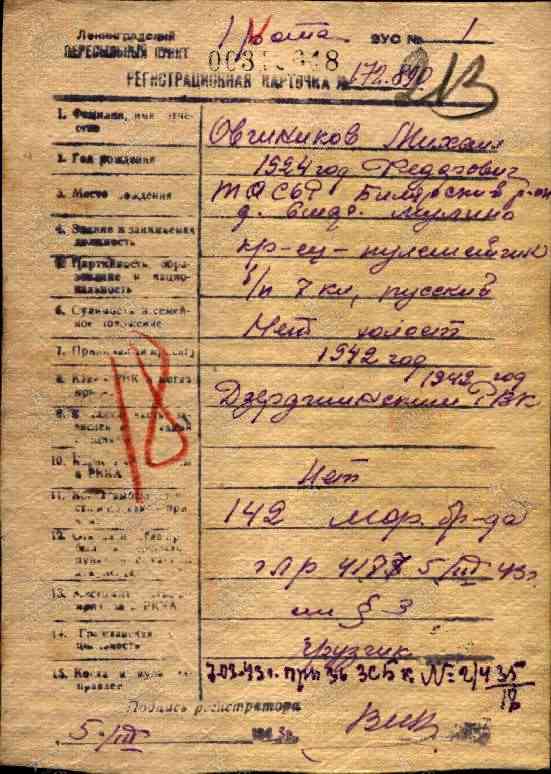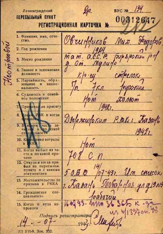 ОВЧИННИКОВ Михаил Фёдорович, 1924, д. Старое Муллино. Член ВЛКСМ. Мобилизован Дзержинским РВК г. Казань 22 авг. 1942. Направлен во 2 миномётно-пулемётное училище г. Кострома. На фронте с янв. 1943, ефрейтор 142 морской СБр 67 А Ленинградского фронта. Ранен 16 фев. 1943 в ходе Синявинской НО. Находился на лечении в ЭГ 268, ГЛР 4177, г. Ленинград. Выписан 5 марта 1943, направлен в 708 СП 115 СД 54 А Волховского фронта. В июле 1943 переведён в роту аэродромного обслуживания 60 БАО 5 РАБ 16 ВА. Награждён медалями «За оборону Ленинграда», «За отвагу».