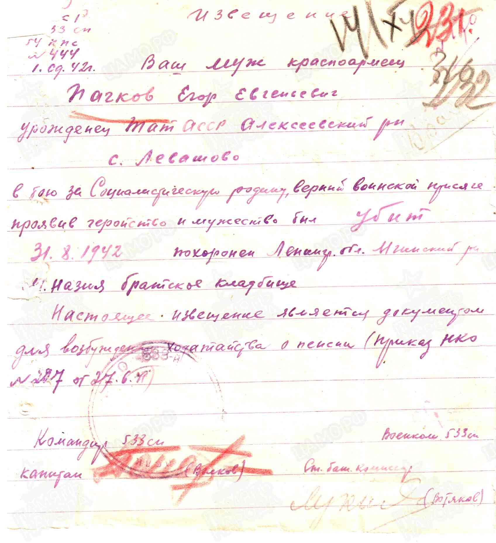 ПАЧКОВ Георгий (Егор) Евгеньевич, 1911, с. Левашёво. До призыва в армию работал в оборонной промышленности. Мобилизован 10 апр. 1942 Кировским РВК г. Казань. Красноармеец, стрелок 533 СП 128 СД 8 А Волховского фронта. Погиб 31 авг. 1942, д. Нижняя Назия. Увековечен на воинском захоронении в с. Путилово, линия Мга-Волховстрой, м.о.г.п. Приладожское, Кировский р-н, Ленинградская обл.