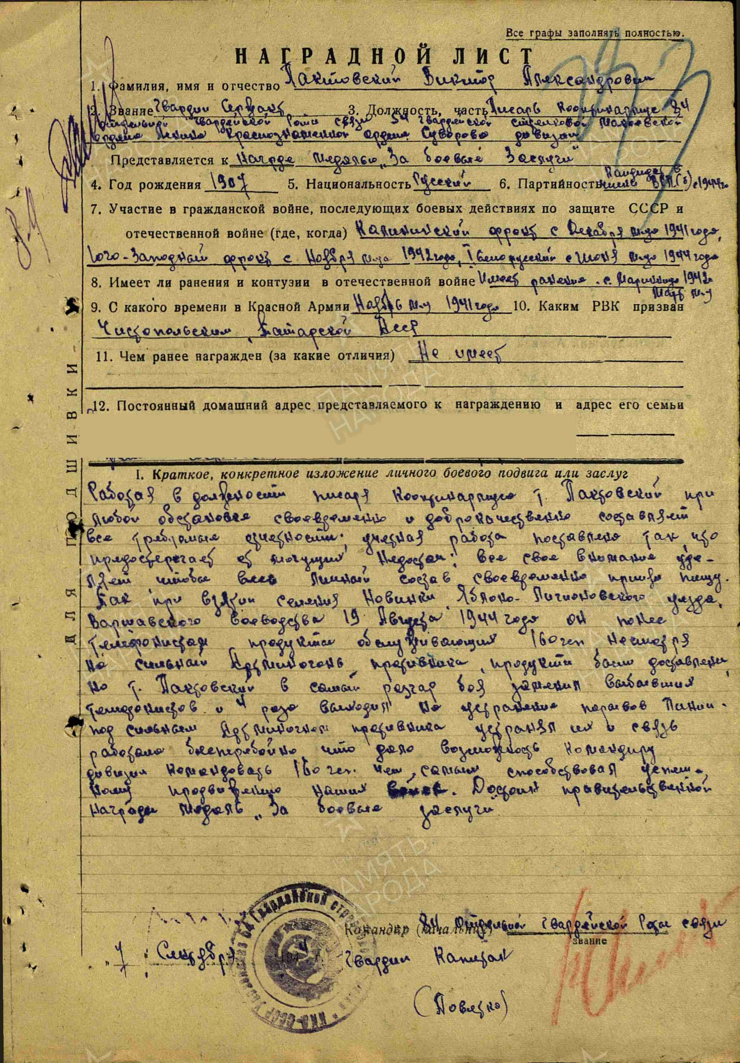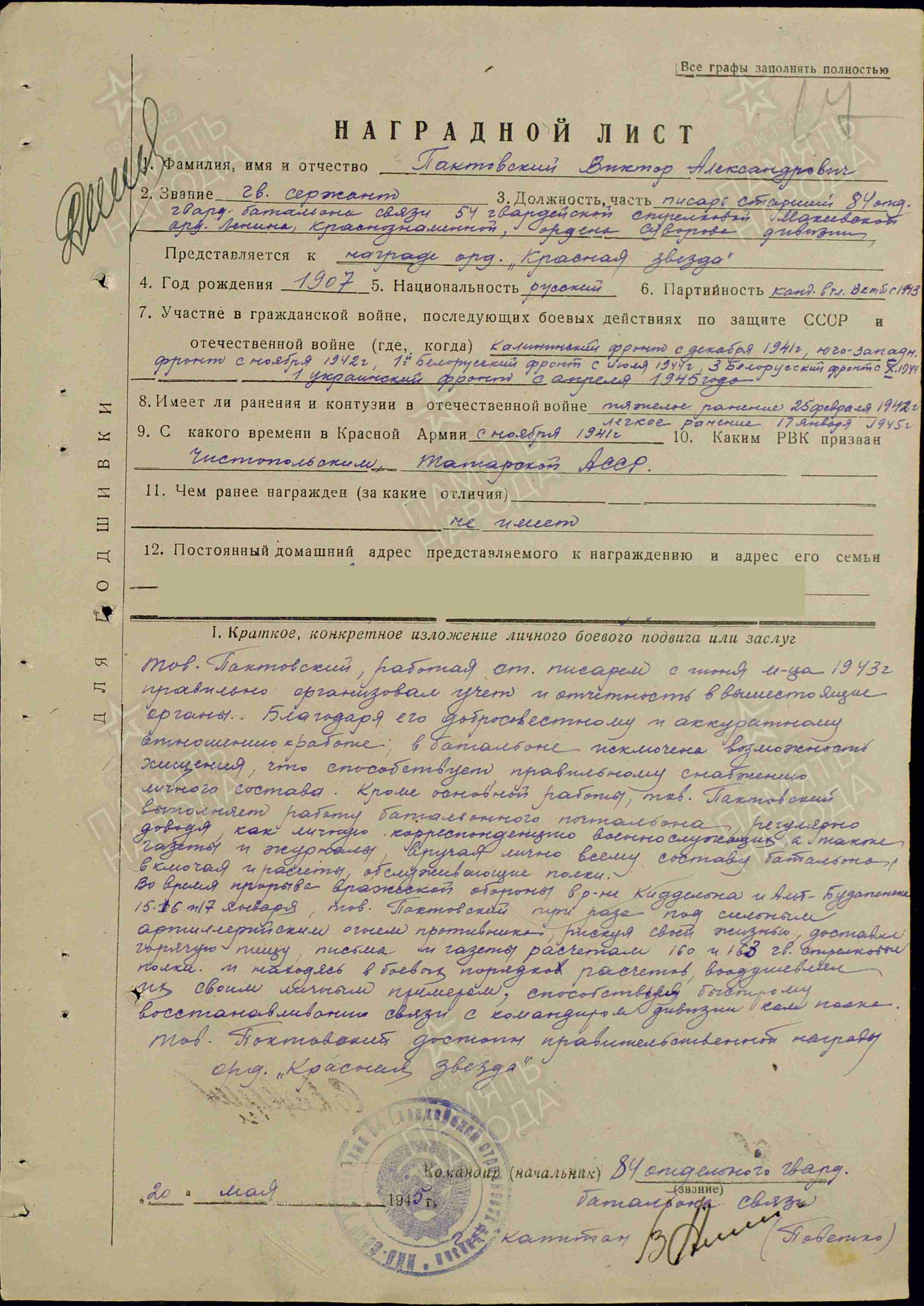 Виктор Александрович Пактовский родился в 1907 году в Чистополе Чистопольского района Татарской АССР. В ноябре 1941 года был призван в ряды Красной Армии Чистопольским РВК. Служил в звании гвардии сержант в должности писарь 84 Отделения Гвардейской роты связи 54 Гвардейской Стрелковой Мореевской ордена Ленина Краснознаменной ордена Суворова дивизии. Был тяжело ранен 25.02.1942, легко ранен 17.01.1945 г.