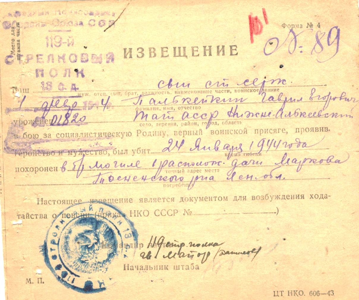 Погиб в бою 24 января 1944 года. Похоронен в братской могиле №6 д. Юркинсон Тосненском районе Ленинградской области.