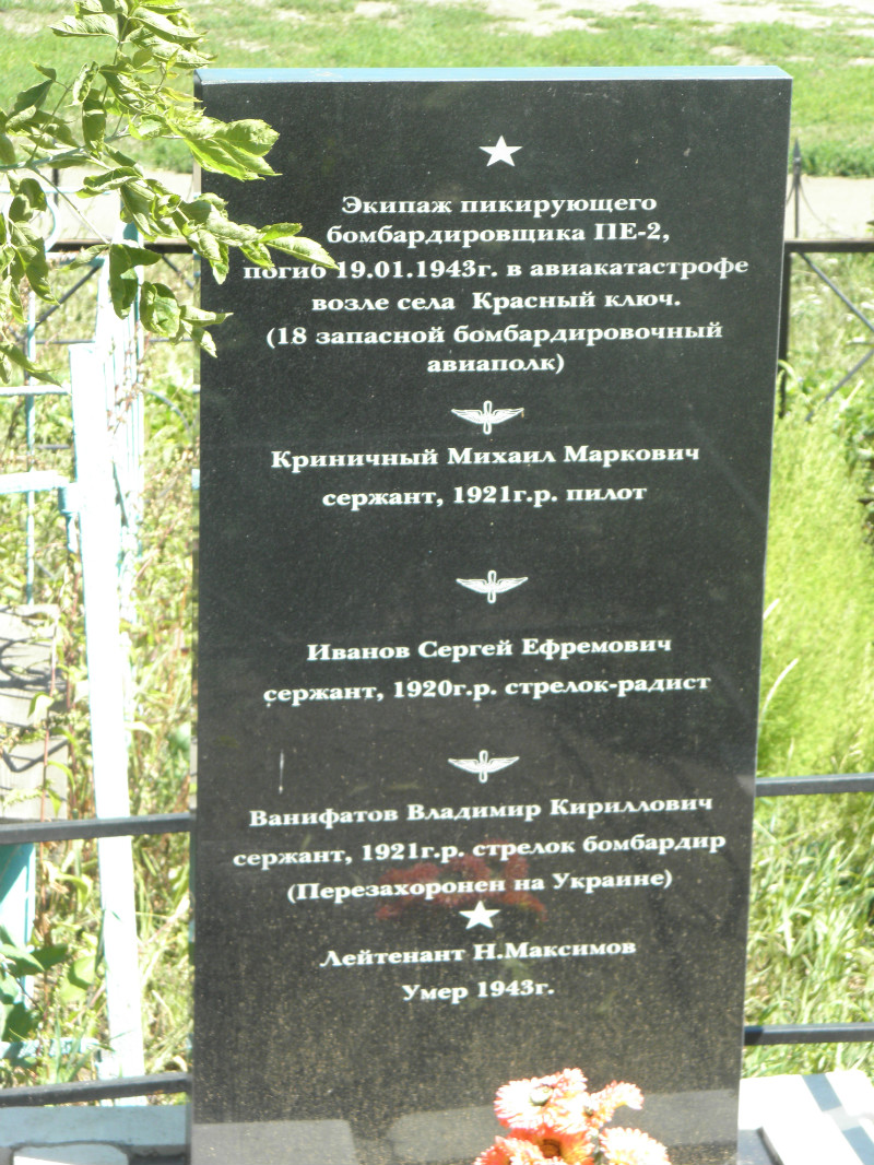 Были перезахоронены останки пилота, сержанта Криничного Михаила Марковича, 1921 г.р., уроженца г.Ворошиловград; стрелка-бомбардира, сержанта Ванифатова Владимира Кирилловича, 1921 г.р., уроженца с. Малые Ерчики Киевской области; стрелка-радиста, сержанта Иванова Сергея Ефремовича, 1920 г.р., которые подняли из двух заброшенных могил в районе с.Красный Ключ члены чистопольского военно-патриотического поискового отряда «Выстрел».