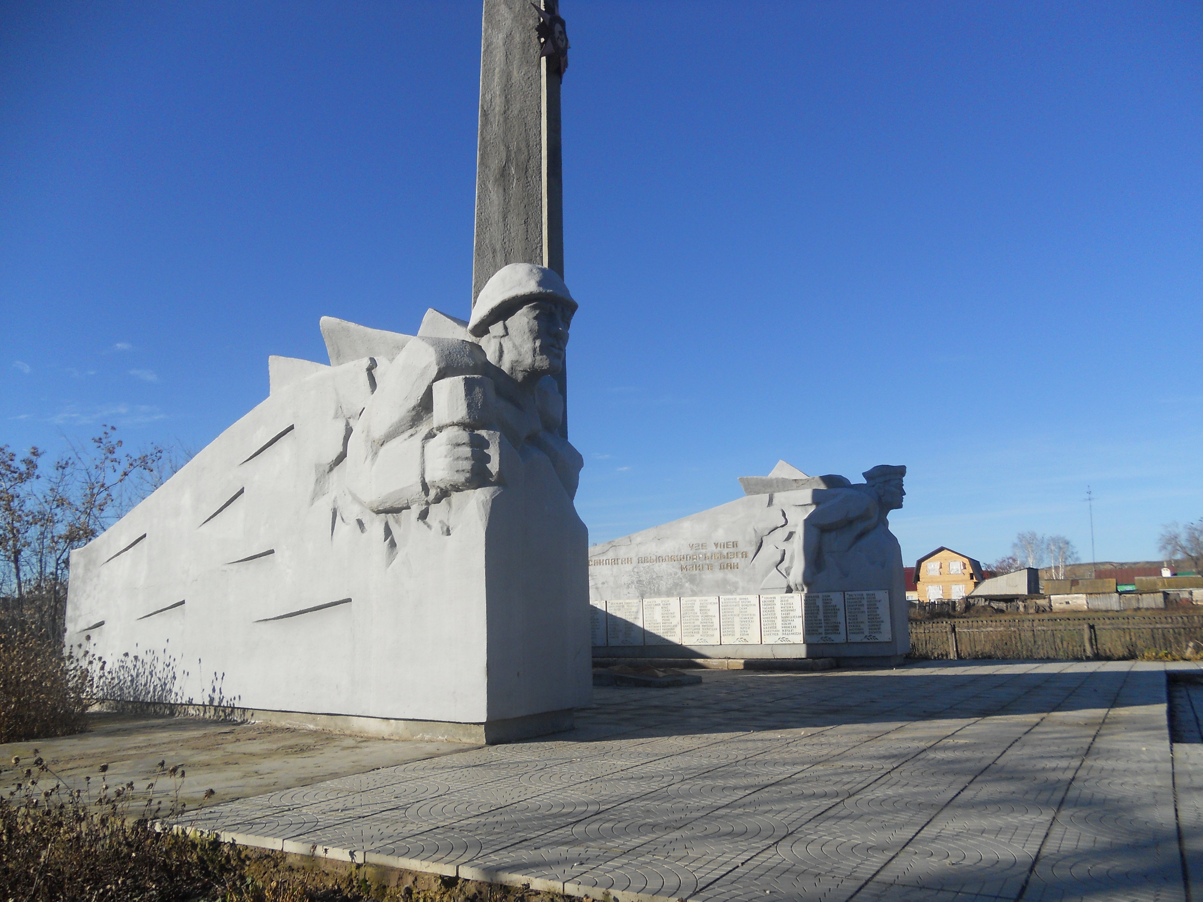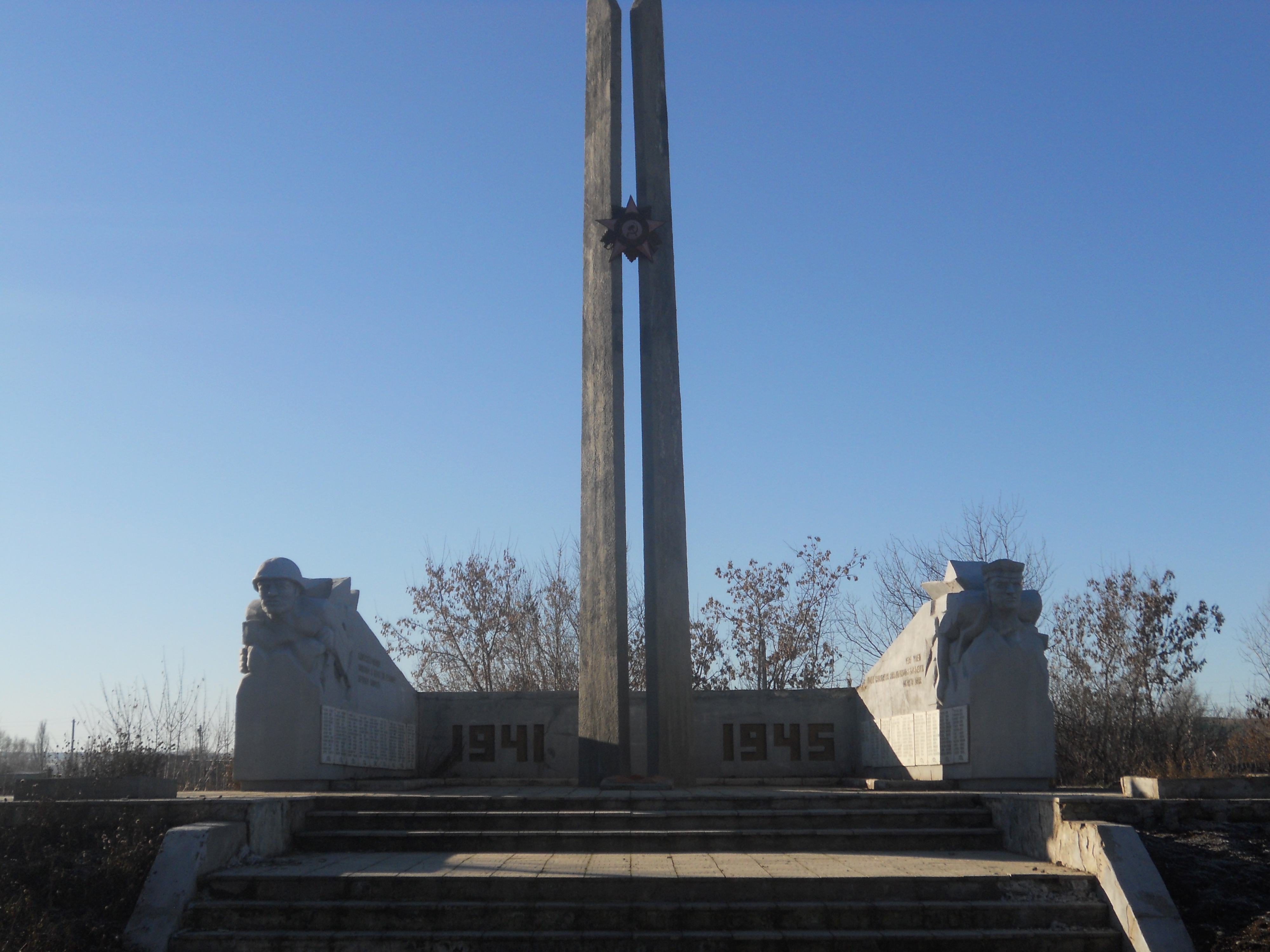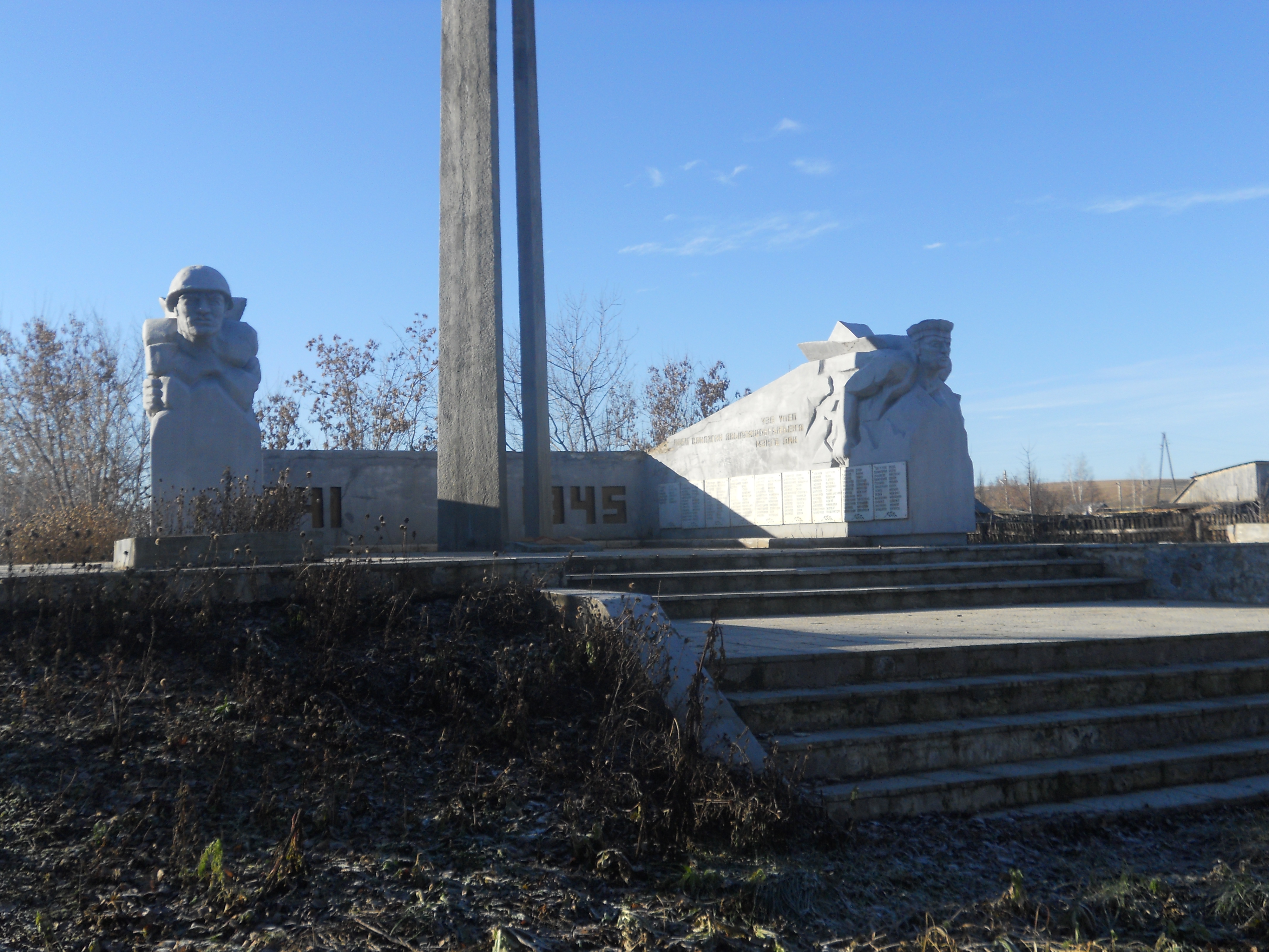 Мемориальная композиция состоящая из трех стен. На средней стене высечены дата начала и окончания Великой Отечественной войны, надпись «Советским воинам павшим в боях за Родину вечная память». Установлены плиты с именами погибших сельчан в Великой Отечественной войне. Высечены фигуры воинов – солдата и матроса. С середины композиции возвышаются две стелы в верхней части которых установлен орден Отечественной войны. Установлены мемориальные доски детям войны и труженикам тыла. К памятнику ведут лестницы из бетонных плит.перед памятником установлен вечный огонь. Памятник огражден металлической оградой.