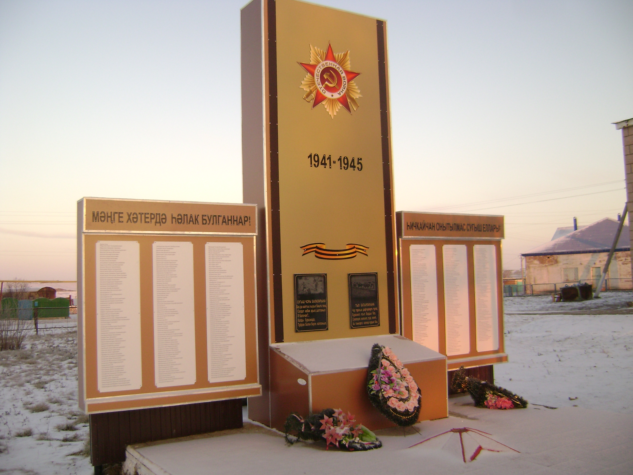 Памятник представляет собой вертикально установленную железобетонную плиту с изображением в верхней части Ордена Отечественной войны, в нижней части георгиевской ленты и мемориальных досок в честь детей войны и тружеников тыла. По бокам установлены плиты из композитного материала с перечнем фамилий и имен павших воинов со всех населенных пунктов Какре-Елгинского СП. В верхней части плит с именами павших установлена надпись «Никто не забыт, ничто не забыто» на татарском языке. Перед памятником на площадке из брусчатки установлена звезда для вечного огня. К памятнику ведет дорожка из брусчатки, по краям которого посажены 389 тюльпанов, по количеству павших воинов – односельчан.