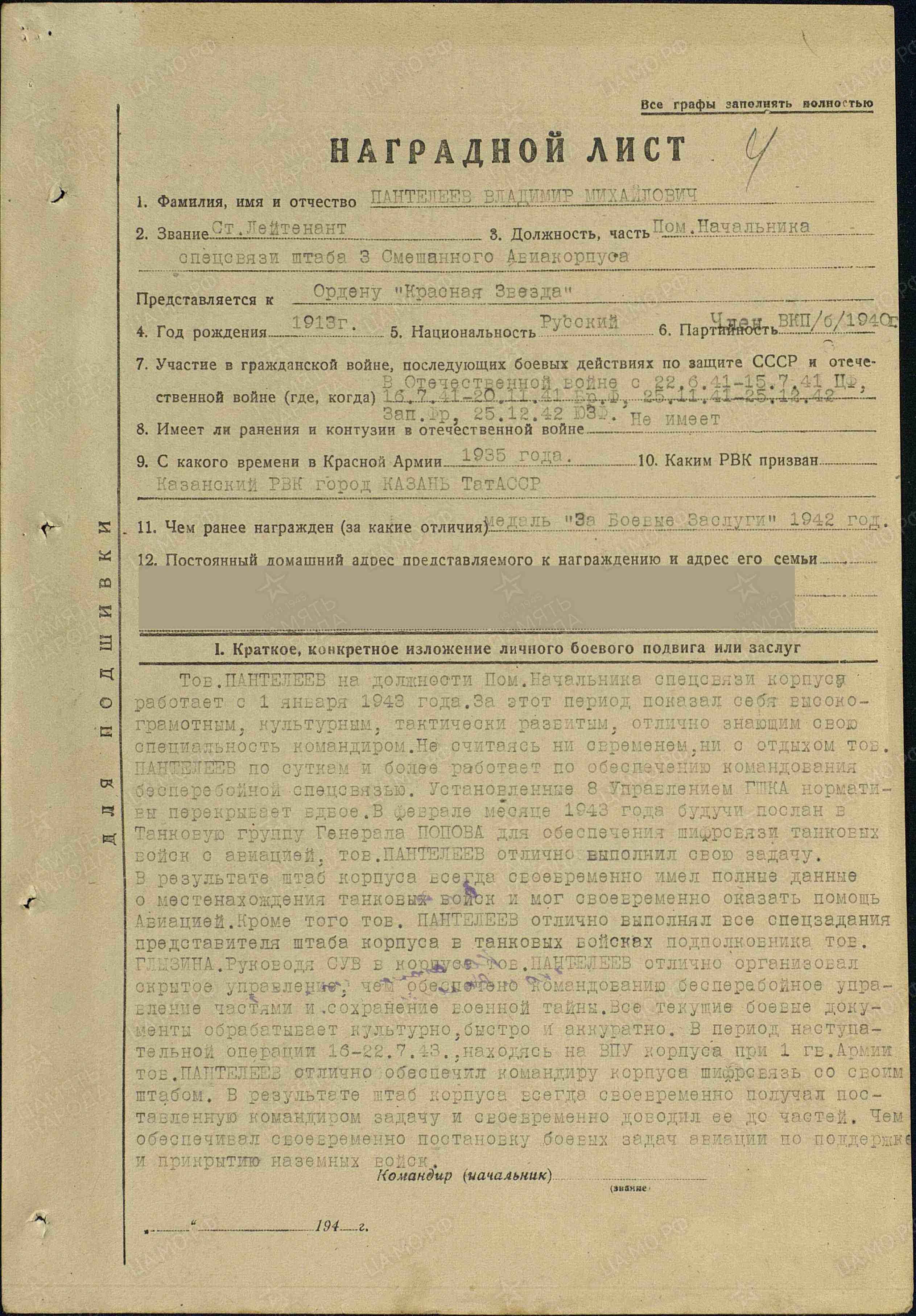 Владимир Михайлович Пантелеев родился 29.03.1913 г. г.Чистополе, ТАССР. В 1935 г. призван в ряды Красной Армии Казанским районным военным комиссариатом. Служил в звании лейтенанта, затем капитана, в должности помощника начальника спецсвязи штаба 3 Смешанного Авиакорпуса. Награжден двумя медалями «За боевые заслуги» (16.01.1942, 06.11.1945), двумя орденами Красной Звезды (31.08.1943, 15.11.1950), медалью «За победу над Германией в Великой Отечественной войне 1941-1945 гг.» (09.05.1945), медалью «За взятие Берлина» (09.06.1945), медалью «За освобождение Праги» (09.06.1945).