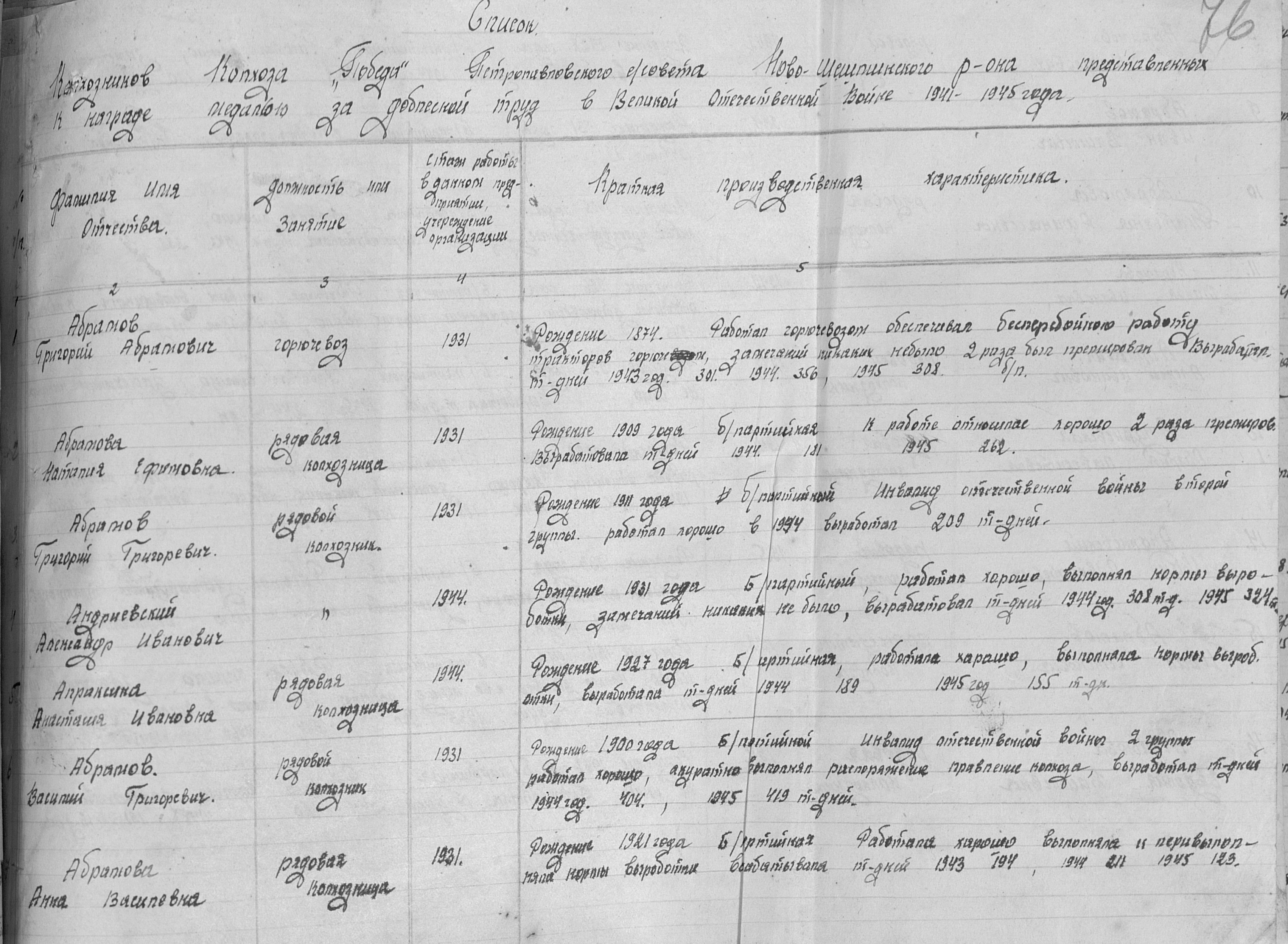 Патренкина Елена Григорьевна родилась в 1908 году. Место жительства: с.Сл.Петропавловская Ново-Шешминский район ТАССР. В годы Великой Отечественной войны работала в колхозе «Победа» свинаркой. Награждена медалью "За доблестный труд в Великой Отечественной войне 1941–1945 гг." (Акт от 01. 1946г.фонд 3610, опись 2, дело №174, лист 80).