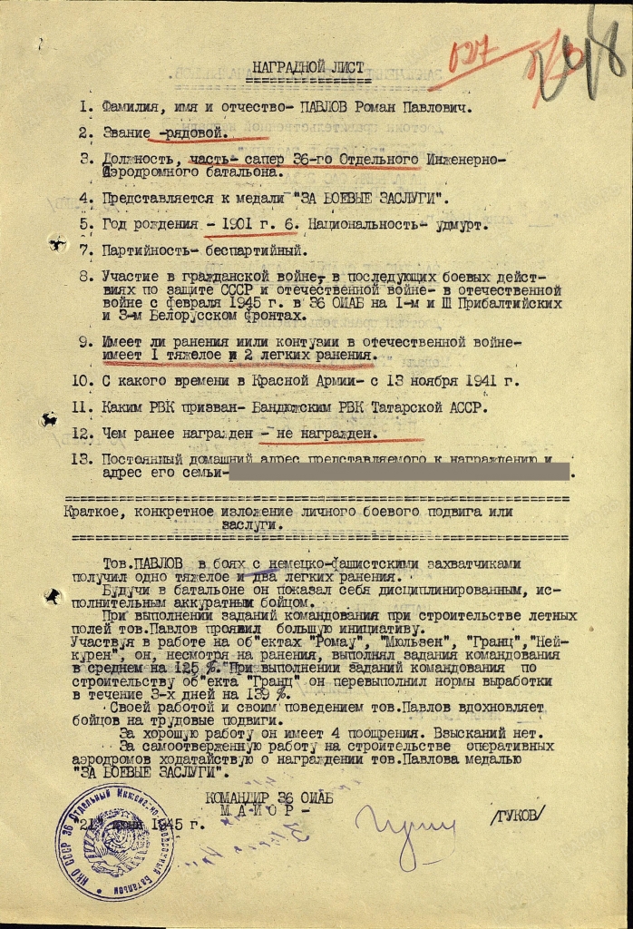 Рядовой, сапер 36 отдельного инженерно-аэродромного батальона. Первый, Третий Прибалтийский, Третий Белорусский. Одно тяжелое, два легких ранения.