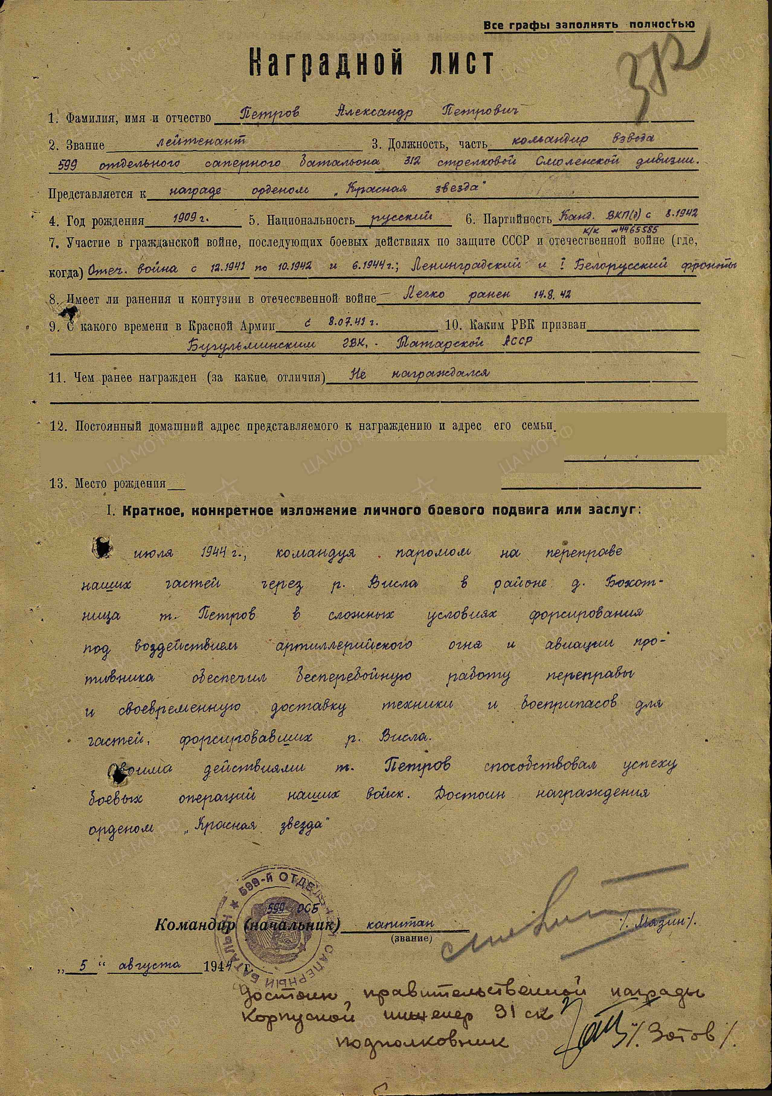 ПЕТРОВ Александр Петрович, 1909, с. Алексеевское. Мобилизован Бугульминским РВК 8 июля 1941г. Воевал на Ленинградском и 1 Белорусском фронтах. Легко ранен 14 авг. 1942г. В 1944г. - лейтенант, командир взвода 599 отд. сапёрного батальона 312 стрелковой дивизии. Отличился командуя переправочным паромом при форсировании р. Висла войсками 91 СК. Награждён орденом Красной Звезды.