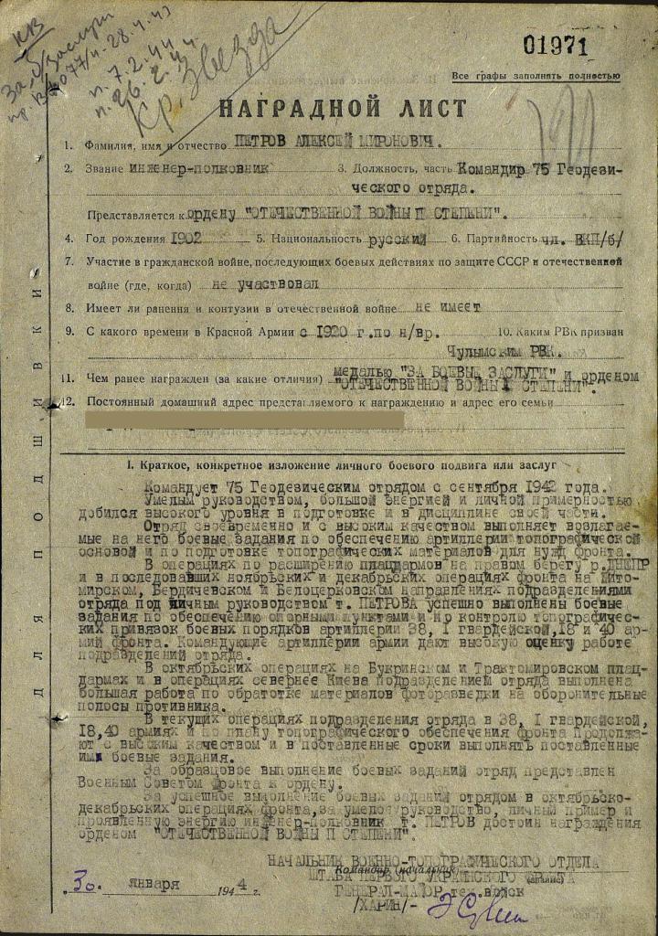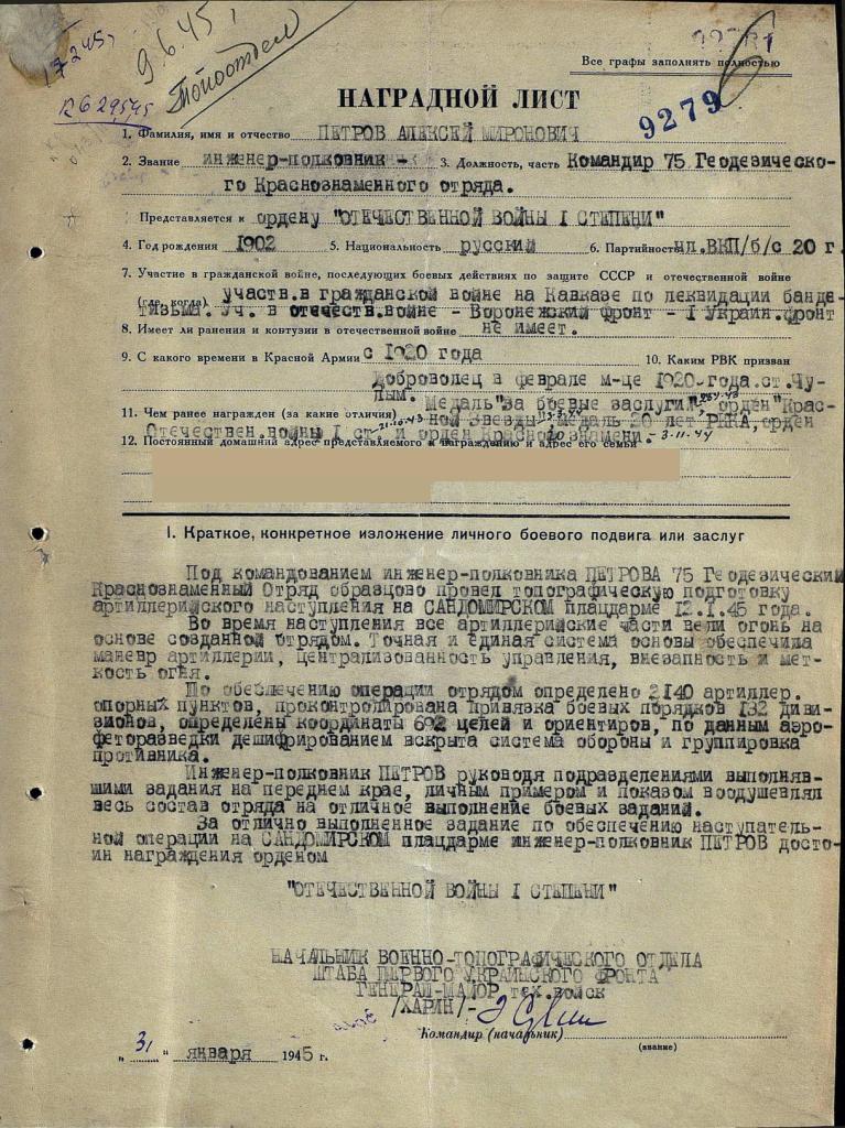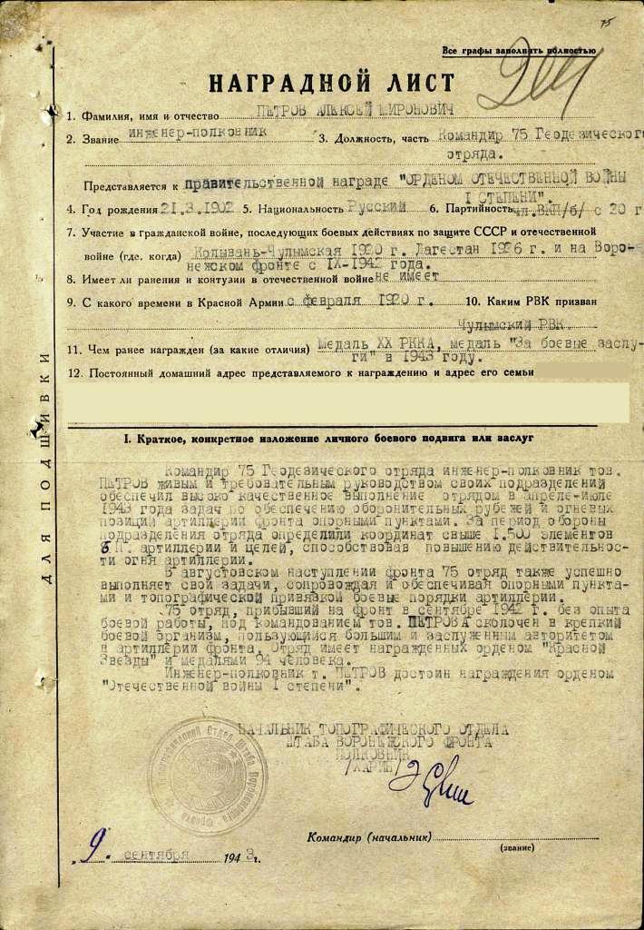 ПЕТРОВ Алексей Миронович, 1902, с. Ромодан. В 1920 г. вступил в Красную Армию, принимал участие в Гражданской войне в Сибири и на Кавказе, в 1925-1926 гг. принимал участие в разоружении Чечни и Дагестана. В сентябре 1942 г. назначен командиром 75 геодезического отряда военно-топографической службы фронтового подчинения, военинженер 1 ранга, инженер-полковник. Воевал на Воронежском, 1 Украинском фронтах, участвовал в освобождении Украины, Польши, Берлинской операции. После войны служил в Войске Польском. В отставку вышел в звании генерал-майор. Награждён тремя орденами Отечественной войны 1 ст., двумя орденами Красного Знамени, орденом Красной Звезды, орденом Ленина, польскими орденами, медалями ХХ лет РККА, "За боевые заслуги", "За освобождение Варшавы", "За взятие Берлина", "За победу над Германией", а также наградным пистолетом Маузер. Скончался 15 мая 1993 г.