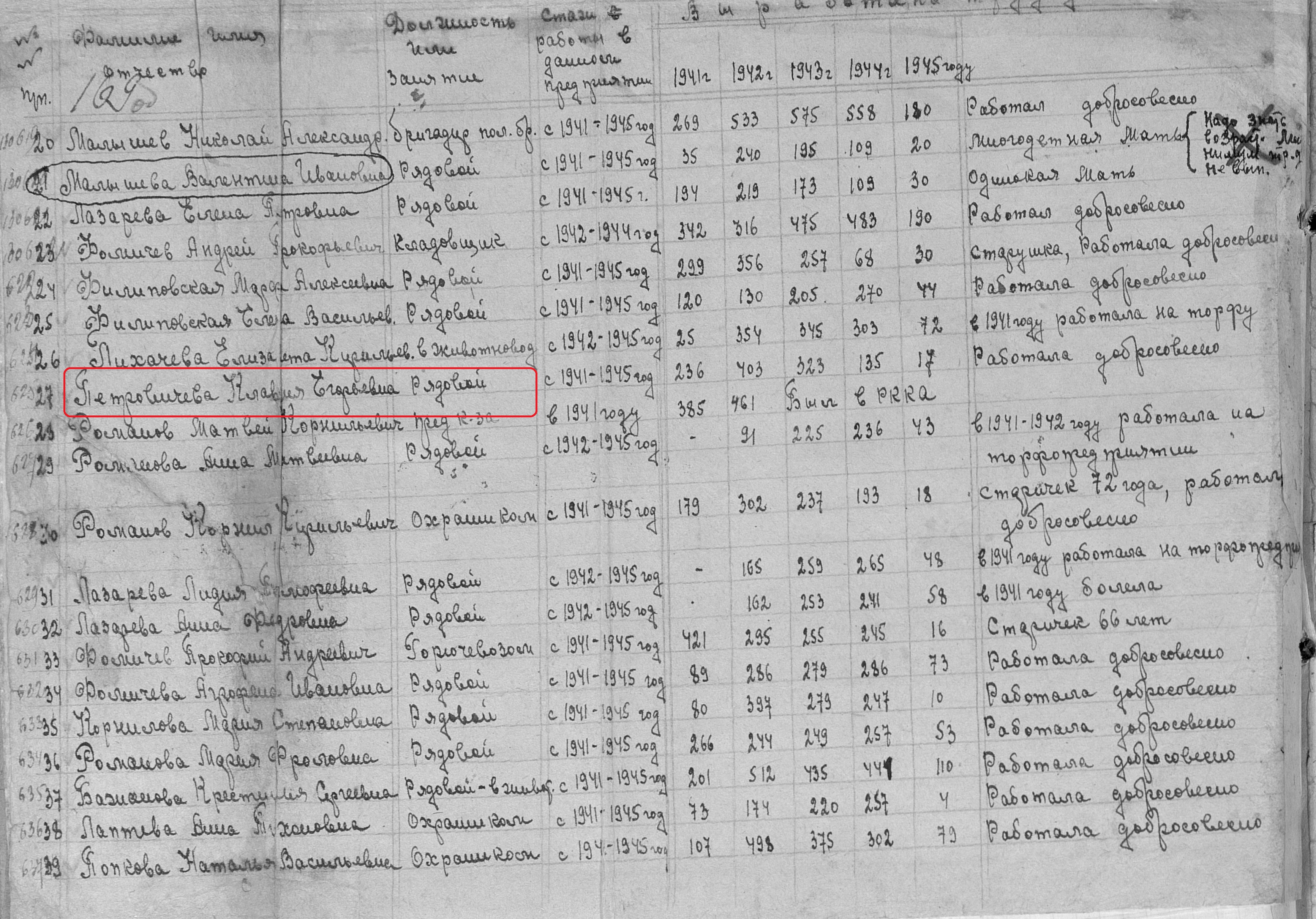 Петровичева Клавдия Егоровна. Место жительства: п. Сосновка Ново-Шешминский район ТАССР. В годы Великой Отечественной войны работала в колхозе им. Калинина рядовой колхозницей. Награждена медалью "За доблестный труд в Великой Отечественной войне 1941–1945 гг." (Акт от 28 апреля 1947 г, фонд 3610, опись 2, дело № 325, лист 169, АК № 130627). Выбыла в г.Казань в 70-х годах.