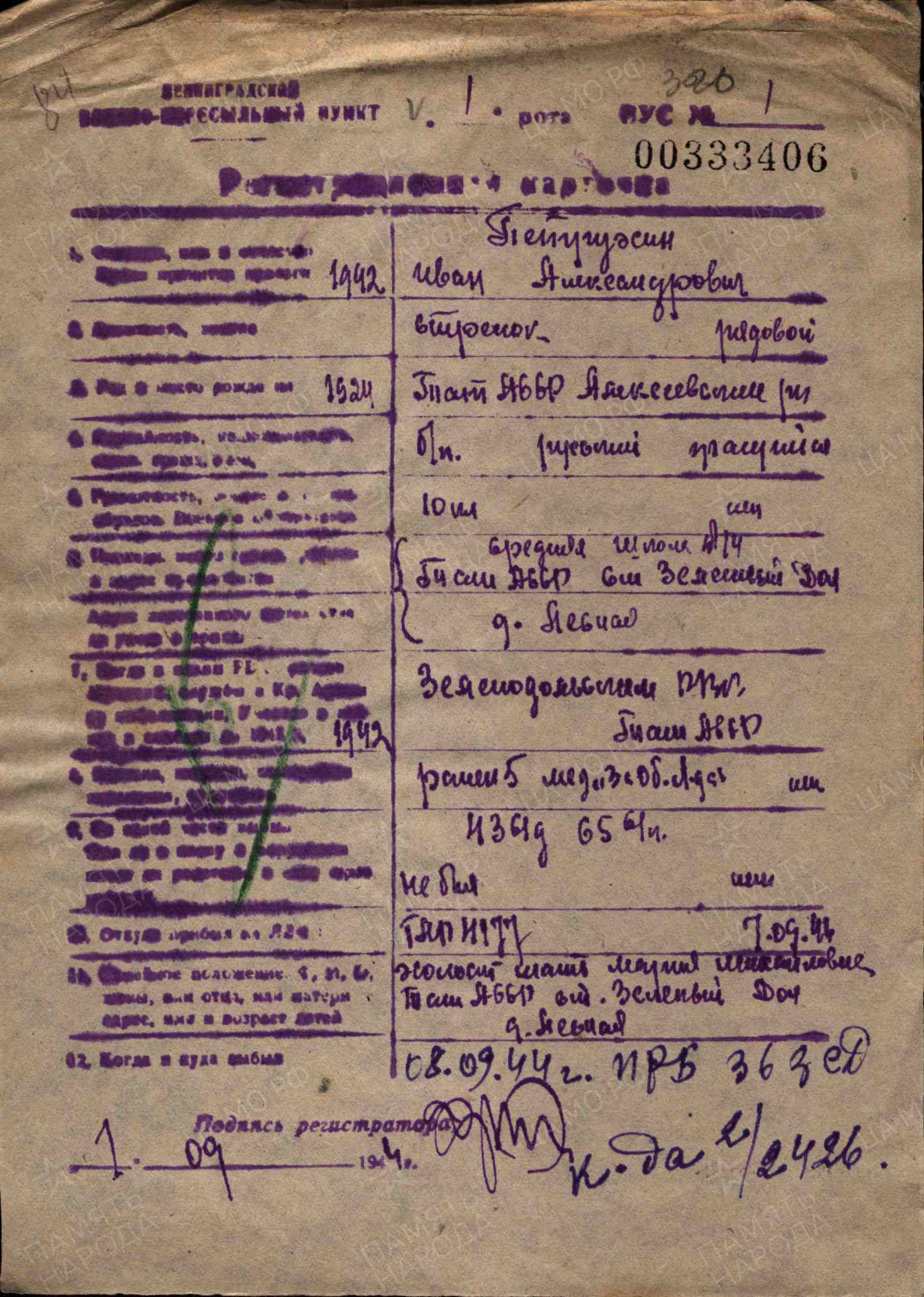 ПЕТРУХИН Иван Александрович, 1924, с. Лебедино. Мобилизован 2 окт. 1942 Зеленодольским РВК. Красноармеец, стрелок. Воевал на Ленинградском, Волховском и Карельском фронте с составе различных армий и стрелковых дивизий: 942 СП 268 СД, 602 СП 109 СД, 242 СП 104 СД, 65 СП 43 СД, 934 СП 256 СД. В боях перенёс пять ранений. Проходил лечение в госпиталях №№ 4177, 1449, 2763, 1170, 1116, 2010. Награждён медалями «За оборону Ленинграда», «За отвагу» (1966).