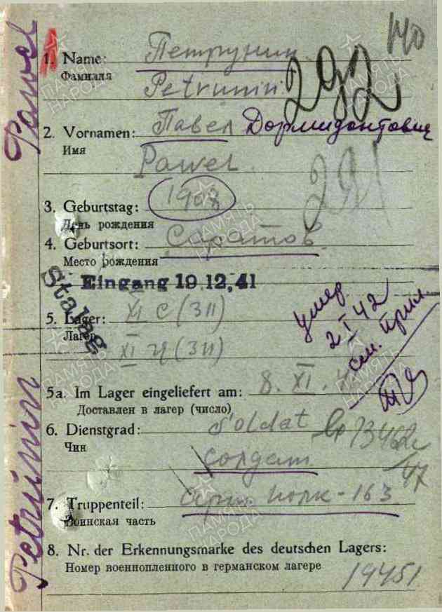 ПЕТРУНИН Павел Дормидонтович, 1908, д. Фёдоровка. Жил в Саратовской обл. Мобилизован в июне 1941 Волжским РВК г. Саратов. Красноармеец, 163 АП 64 СД 13 А/ 19 А Западного фронта. Попал в плен 13 окт. 1941 под г. Вязьма, Смоленская обл. Содержался в лагере в/пленных XI D (321) Эрбке, XI C (311) Берген-Бельзен, Нижняя Саксония, Германия. Умер 2 янв. 1942.