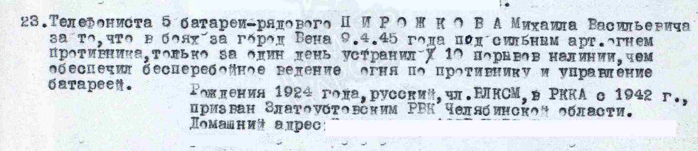 ПИРОЖКОВ Михаил Васильевич, 1924, д. Донгуз/ Красный Кустарь. Член ВЛКСМ. Мобилизован в авг. 1942 Златоустовским РВК Челябинской обл. Красноармеец, телефонист/ орудийный номер 127 пушечного АП 30 ПАБр (тяж. гаубичной АБр) 9 АртД прорыва РГК 1 гв. А/ 6 А/ 3 гв. А Юго-Западного фронта, 8 гв. А 3 Украинского фронта. Участвовал в штурме г. Вена в составе 2 АртК прорыва. Награждён медалями «За боевые заслуги», «За взятие Вены».