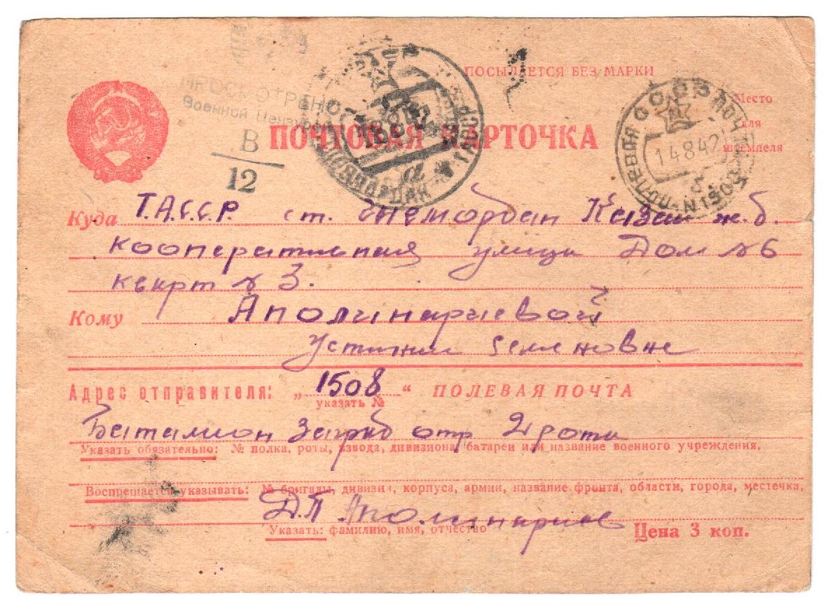 ПИСЬМА ВОЕННЫХ ЛЕТ АППОЛИНАРИЕВА Д.П. Район: КукморскийПисьмо с фронта от Апполинариева Д.П. супруге Апполинариевой Устинье Семеновне.Прикреплённые изображения: Архивы Опубликовано 24 ноября, 2017 - 09:27 пользователем МБУК Краеведчес...