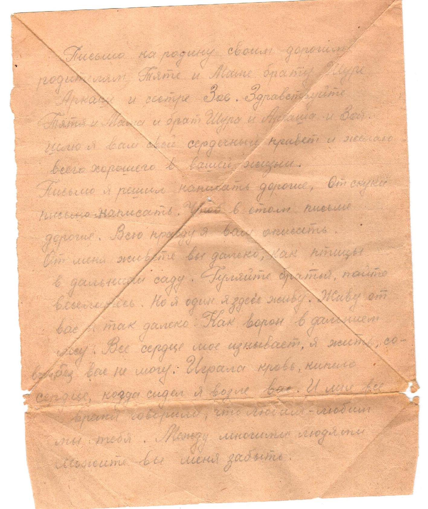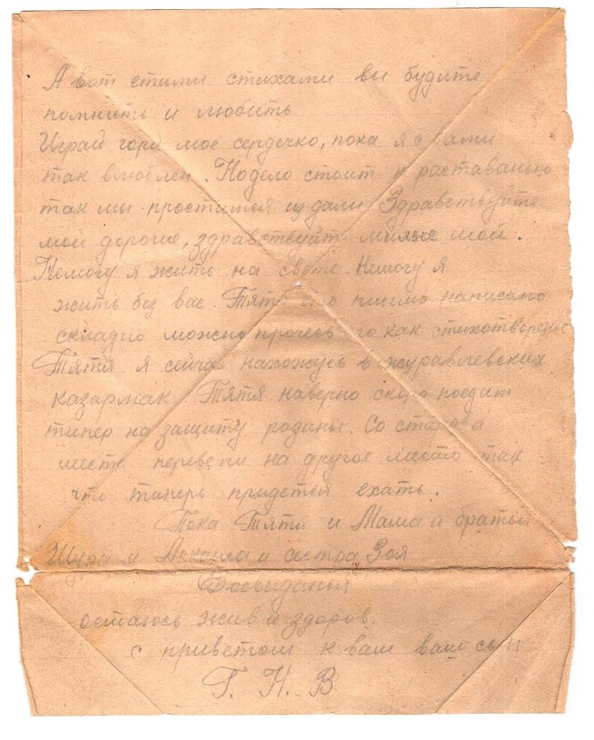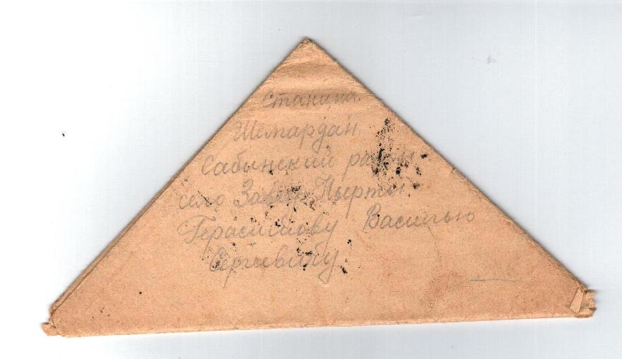 Письмо с фронта от Герасимова Николая Васильевича из с.Завод Нырты Кукморского района Герасимову Василию Сергеевичу. Отрывок из письма: "Письмо на родину своим дорогим родителям Тяте и Мане, брату Шуре, Аркаше и сестре Зое. Письмо я решил написать дорогие, От меня живёте вы далеко, как птицы в дальнем саду. Гуляйте братья, пойте, веселитесь... Тятя я сейчас нахожусь в журавлевских Казармах. До свидание. Остаюсь жив и здоров. С приветом у Вам ваш сын."