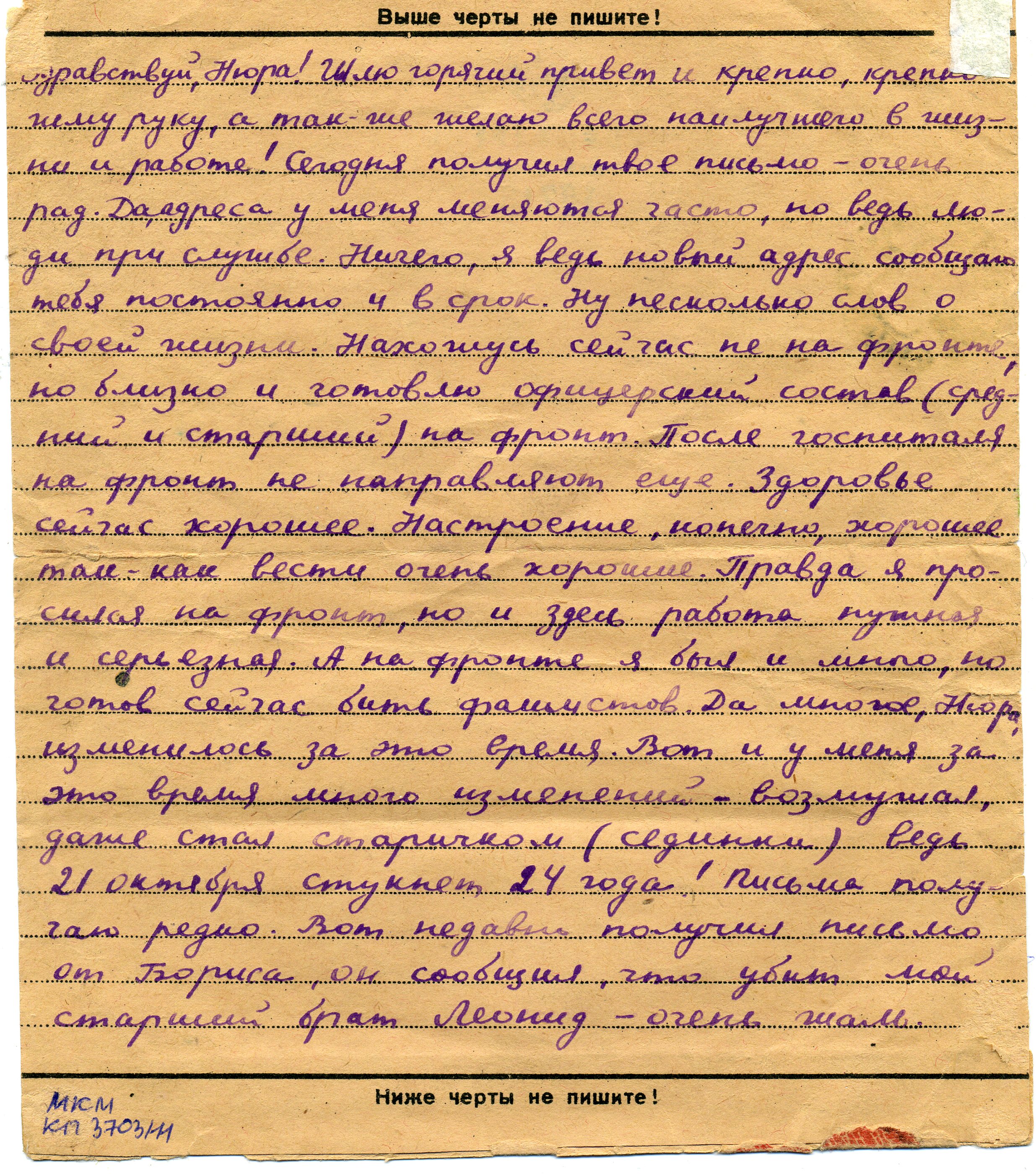 Здравствуй, Нюра! Шлю горячий привет и кркпко крепко жму руку, а так же желаю всего наилучшего в жизни и работе! Сегодня получил твое письмо – очень рад. Да, адреса у меня меняются часто. Но ведь люди при службе. Ничего, я ведь новый адрес сообщаю тебе постоянно и в срок. Ну несколько слов о своей жизни. Нахожусь сейчас не на фронте, а близко, готовлю офицерский состав (средний и старший) на фронт. После госпиталя на фронт не направляют еще. Здоровье сейчас хорошее. Настроение, конечно, хорошее, так как вести очень хорошие. Правда, я просился на фронт, но и здесь работа нужная и серьезная. А на фронте я был и много, но сейчас готов бить фашистов. Да, многое, Нюра, изменилось за это время. Вот и у меня за это время много изменений, даже стал старичком (сединки), ведь 21 октября стукнет 24 года! Письма получаю редко. Вот недавно получил письмо от Бориса, он сообщил, что убит мой старший брат Леонид – очень жаль.