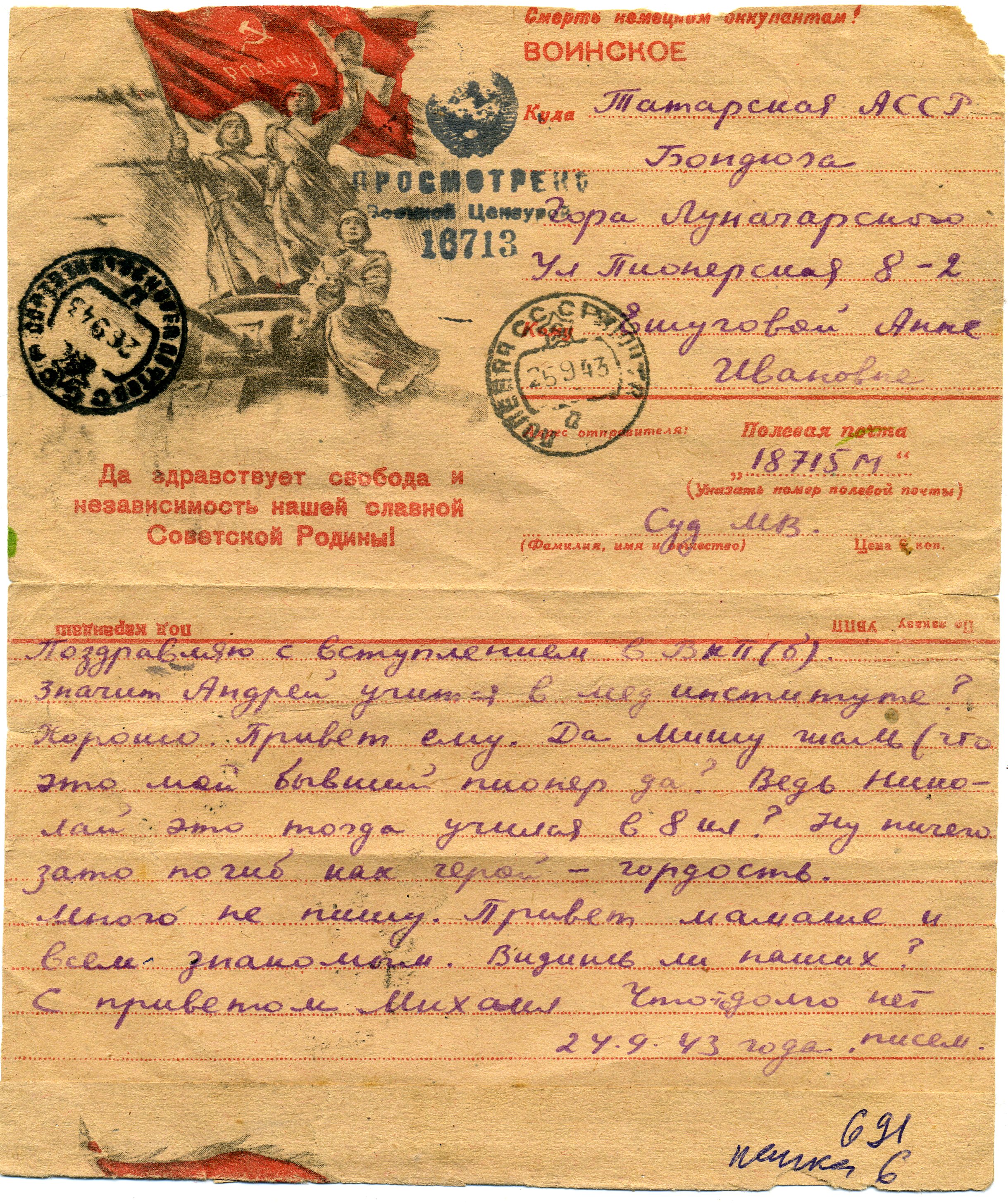 ПИСЬМО С ФРОНТА МИХАИЛА ВЛАДИМИРОВИЧА СУДНИШНИКОВА ОДНОКЛАССНИЦЕ АННЕ ИВАНОВНЕ ЕШУГОВОЙ