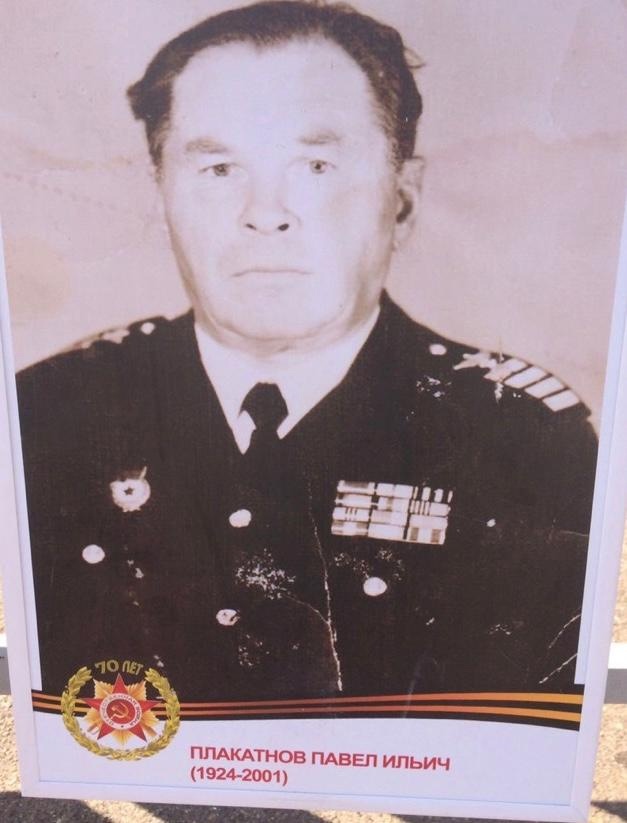 Плакатнов Павел Ильич, родился 18 января 1924 г. в с.Покровское, Мамадышского района, ТАССР. 28 сентября 1942 г. призван в ряды Красной Армии Кзыл-Армейским районным военным комиссариатом. Служил в звании старшины 1 статьи, в должности командира отделением рулевых бронекатера 31 ОАД КС КМОР к/л «Нарев». Был награжден орденом Отечественной войны II степени, медалью "За оборону Ленинграда", медалью "За победу над Германией в Великой Отечественной войне 1941-1945 гг.". 8 марта 1950 г. уволен в запас. С семьей проживал в г.Чистополе, ТАССР, работал на Судоремонтном заводе, затем капитаном т/х Волго-Дон 5026.