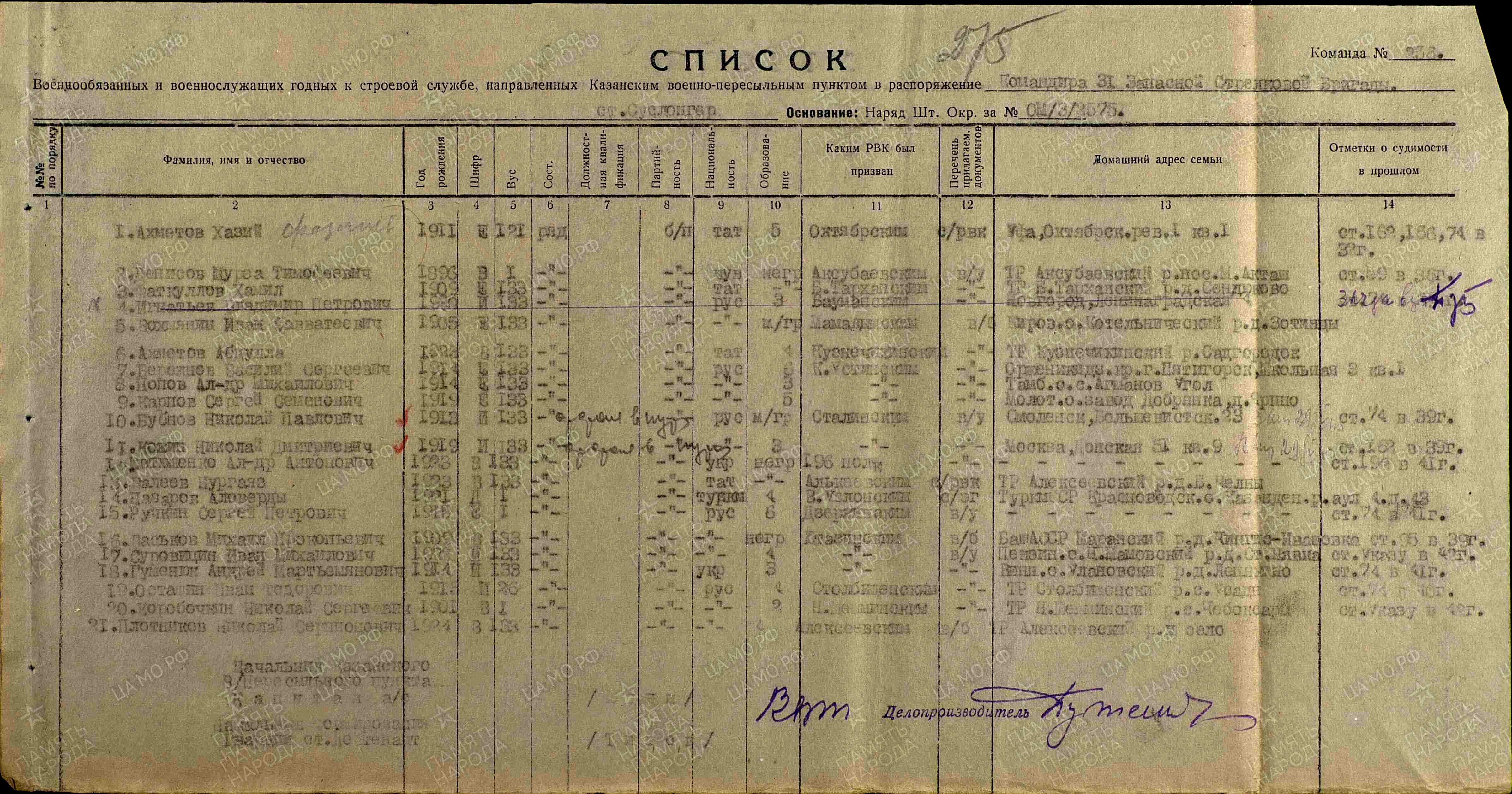 ПЛОТНИКОВ Николай Серпионович, 1924, с. Алексеевское. Мобилизован Алексеевским РВК в 1943 г. 25 мая 1943 г. Казанским военно-пересыльным пунктом (111 запасной стр. полк) направлен в распоряжение командования 31 запасной стрелковой бригады (ст. Суслонгер). Дальнейшая судьба неизвестна.