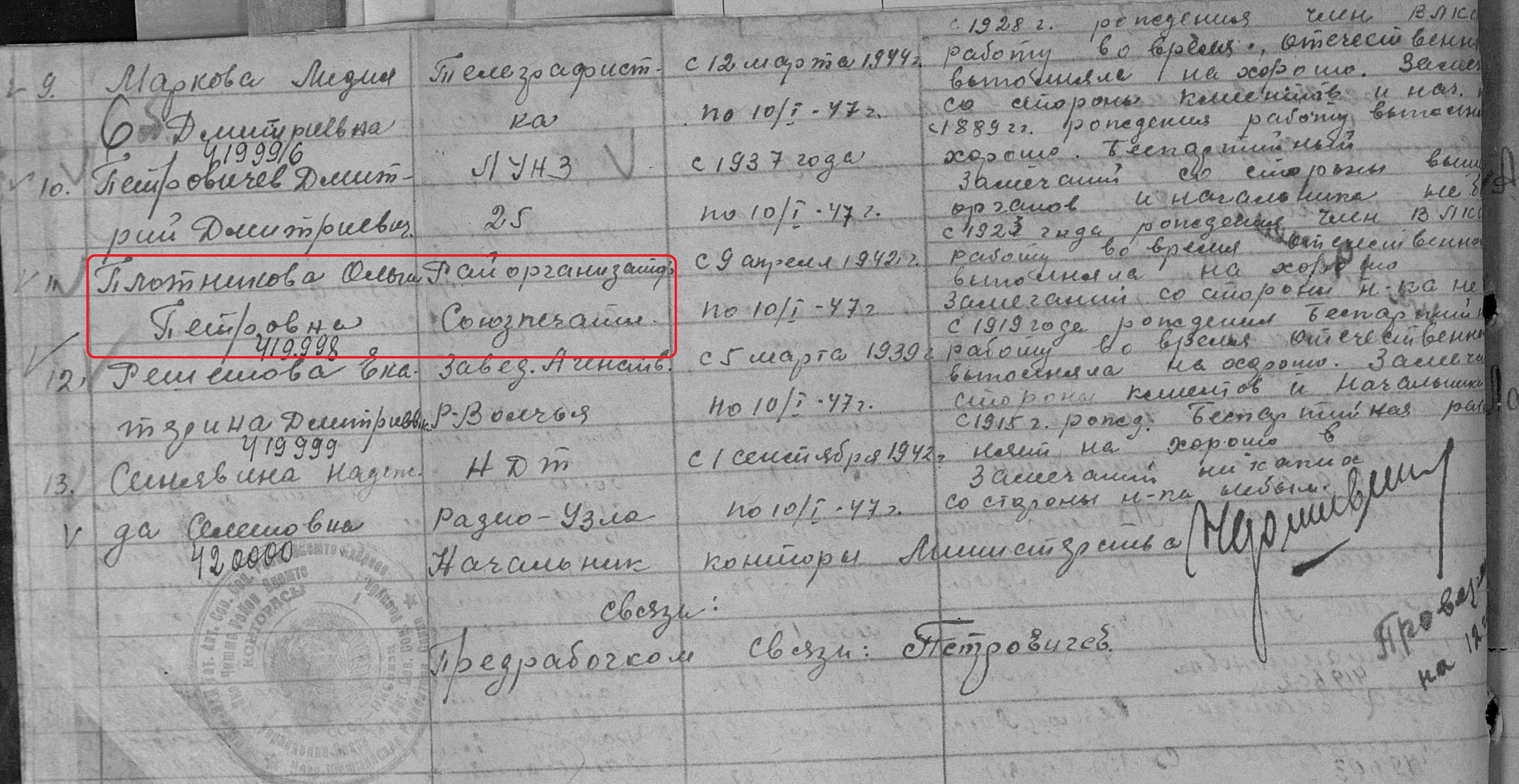 Плотникова Ольга Петровна родилась в 1921 году. Место жительства: с.Сл.Петропавловская Ново-Шешминский район ТАССР. В годы Великой Отечественной войны в Райконторе министерство связи Ново-Шешминского района райорганизатором союзпечати. Награждена медалью "За доблестный труд в Великой Отечественной войне 1941–1945 гг." (Акт от 28 апреля 1947 г, фонд 3610, опись 2, дело № 325, лист 6, .№ 419998).