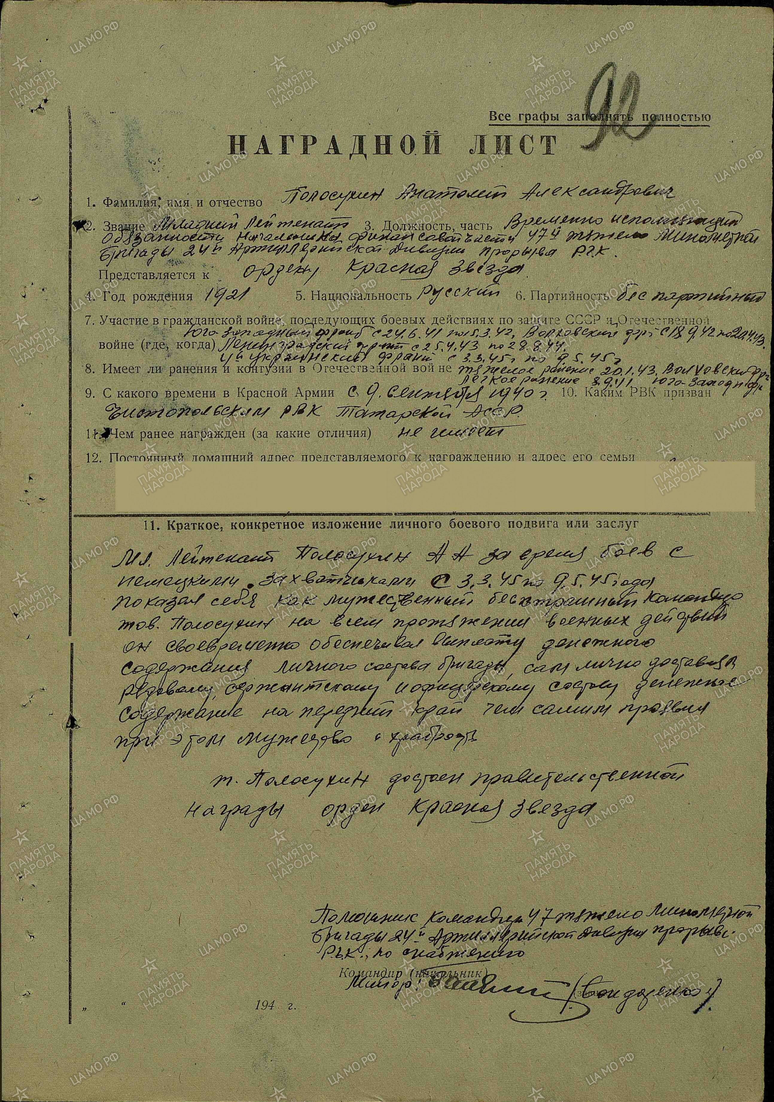 Полосухин Анатолий Александрович родился 1921 году в г.Чистополе, был призван Чистопольским РВК.