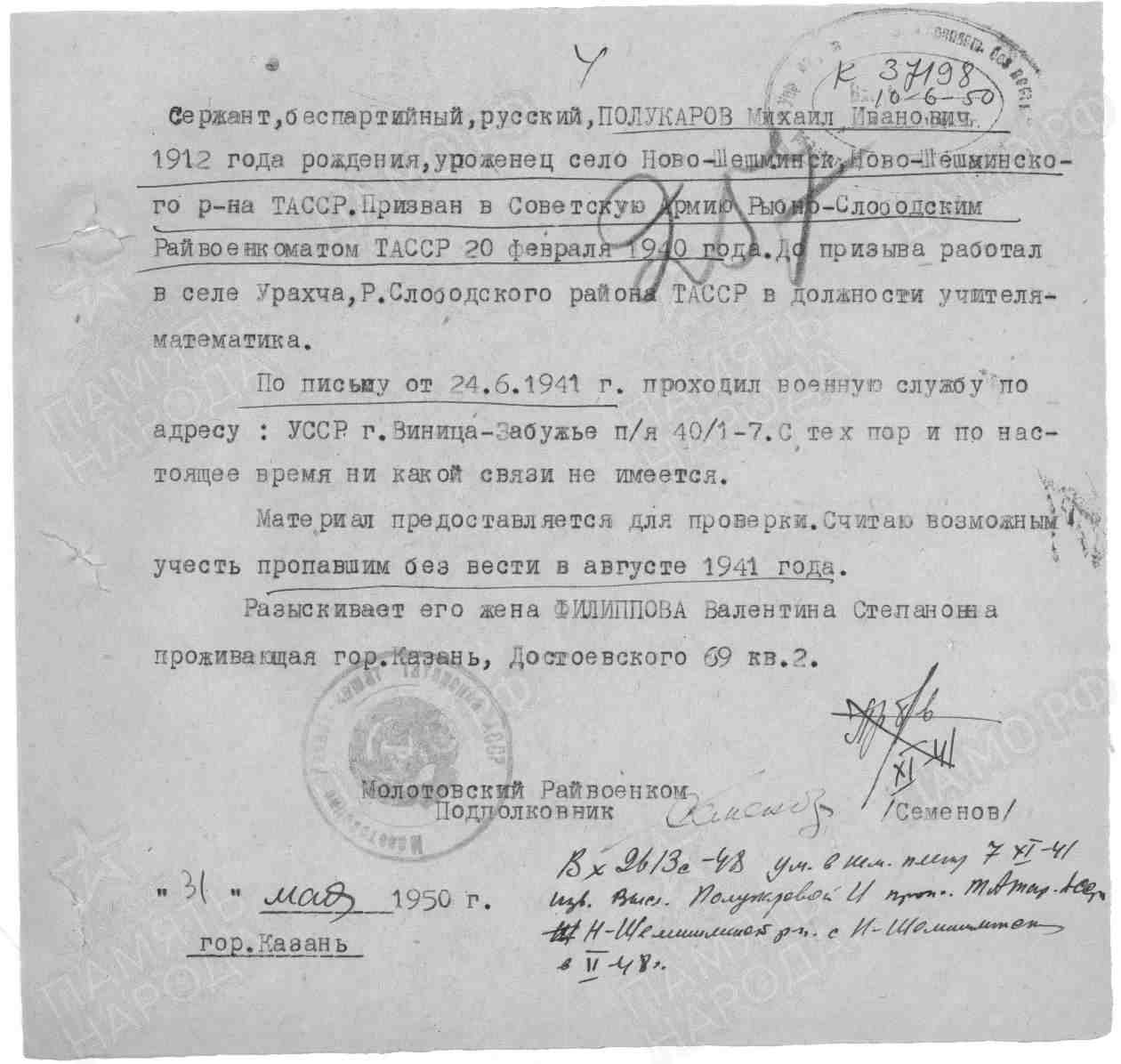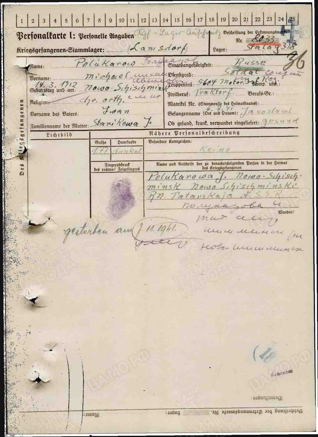 Полукаров Михаил Иванович родился в 1912 году в с.Новошешминск Казанской губернии Чистопольского уезда Новошешминской волости. Призван в Советскую армию Рыбно-Слободским РВК 20 февраля 1940 года. Сержант, беспартийный, руский. До призыва работал в селе Урахча, Слободского района ТАССР в должности учителя математики. Служил в моторизированных частях. Попал в плен 6 июля 1941 года, в плену был трактористом. Умер в плену 7 ноября 1941 года.