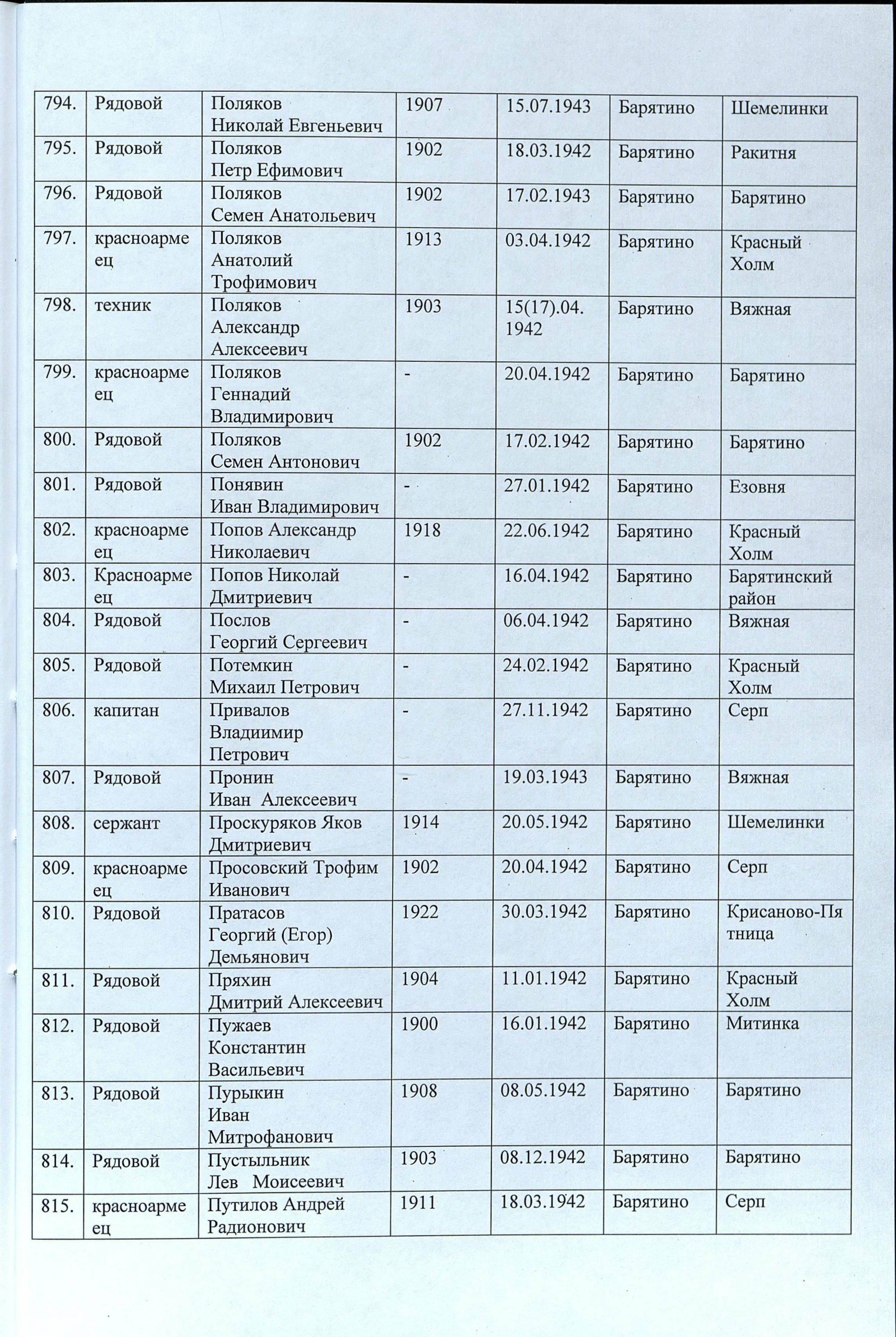 Родился в 1903 г. в д. Михайловка Чистопольского уезда Казанской губернии. Призван на фронт Чистопольским РВК. Техник-интендант 2 ранга, начальник финансовой службы 1130 стрелкового полка 336 стрелковой дивизии Александр Алексеевич Поляков убит 16 апреля 1942 г. Захоронен в Калужской области в с. Барятино на ул. Советской между зданием Сбербанка и домом 3 в братской могиле.