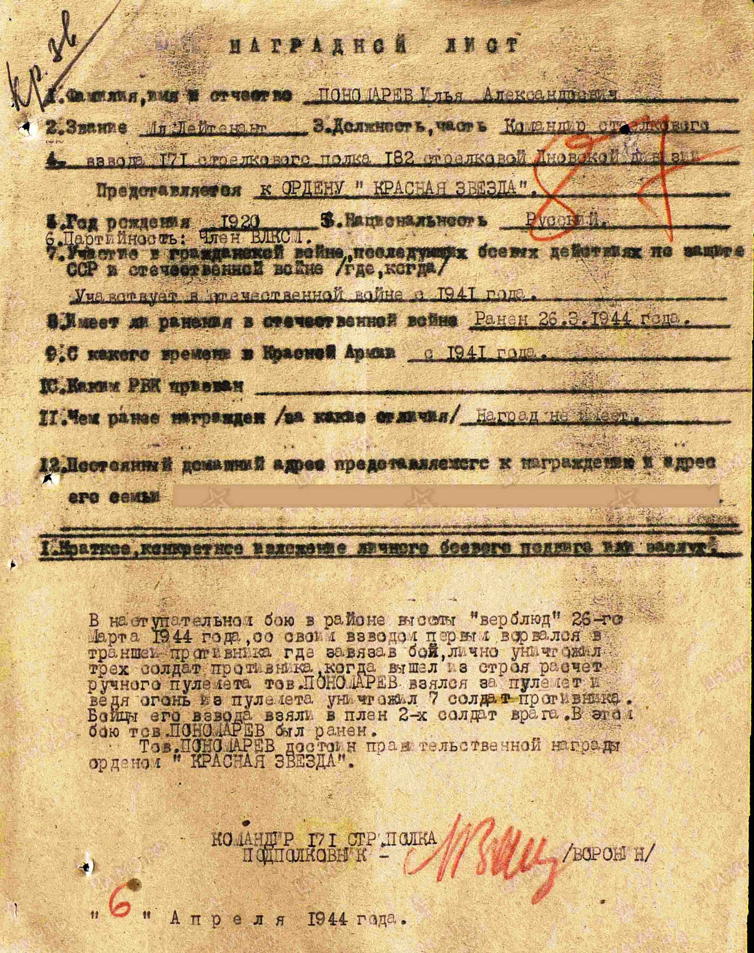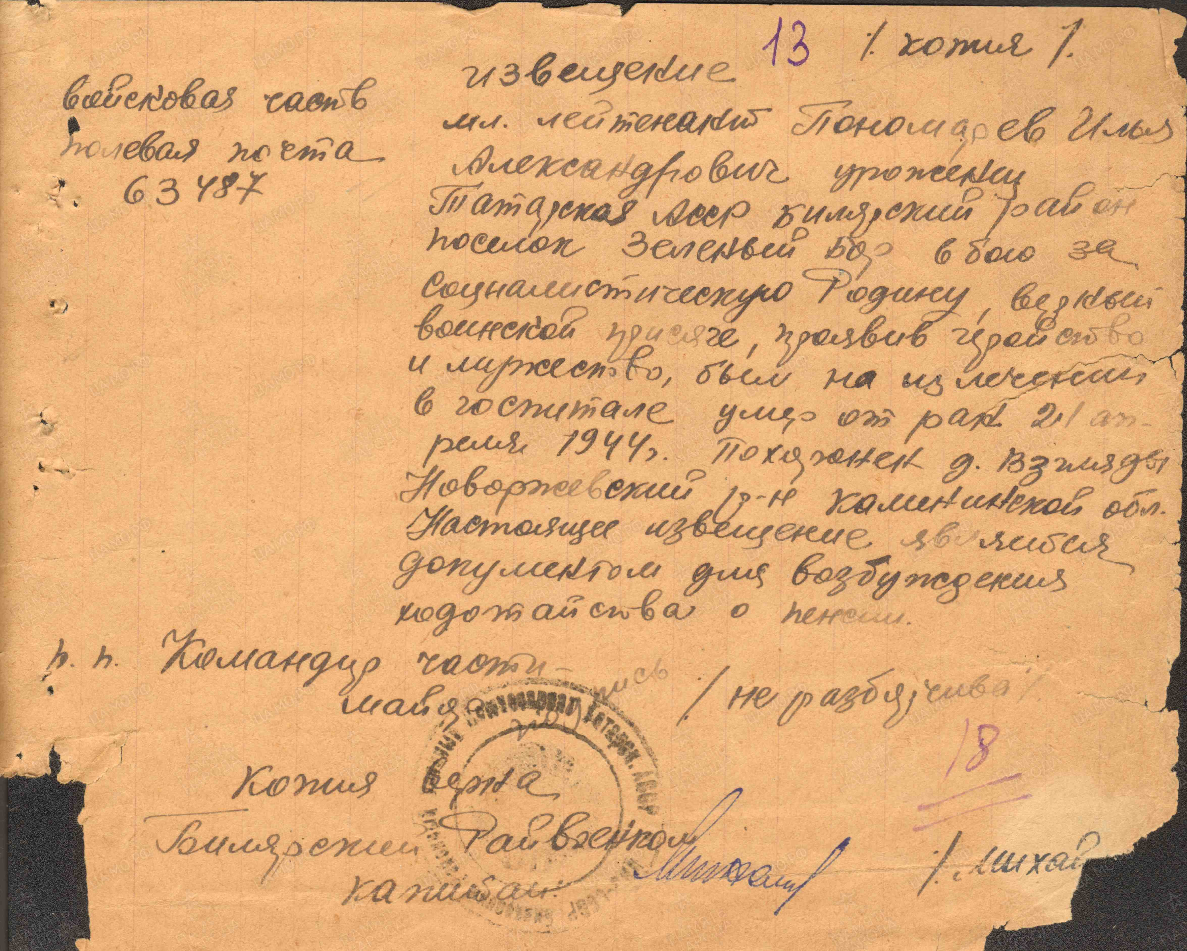 ПОНОМАРЁВ Илья Александрович, 1920, п. Зелёный бор. Член ВЛКСМ. Мобилизован 1 янв. 1942 Сталинским РВК г. Казань. В 1943-1944 – мл. лейтенант, ком. взвода 232 СП/ 171 СП 182 СД 34 А/ Северо-Западного фронта/ 1 УдА 2 Прибалтийского фронта. Тяжело ранен 26 марта 1944 в бою за выс. «Верблюд». Награждён орденом Красной Звезды. Умер от ран в ППГ 2311, д. Взгляды, Новоржевский р-н, Калининская (Псковская) обл. Увековечен на воинском мемориале в г. Новоржев.