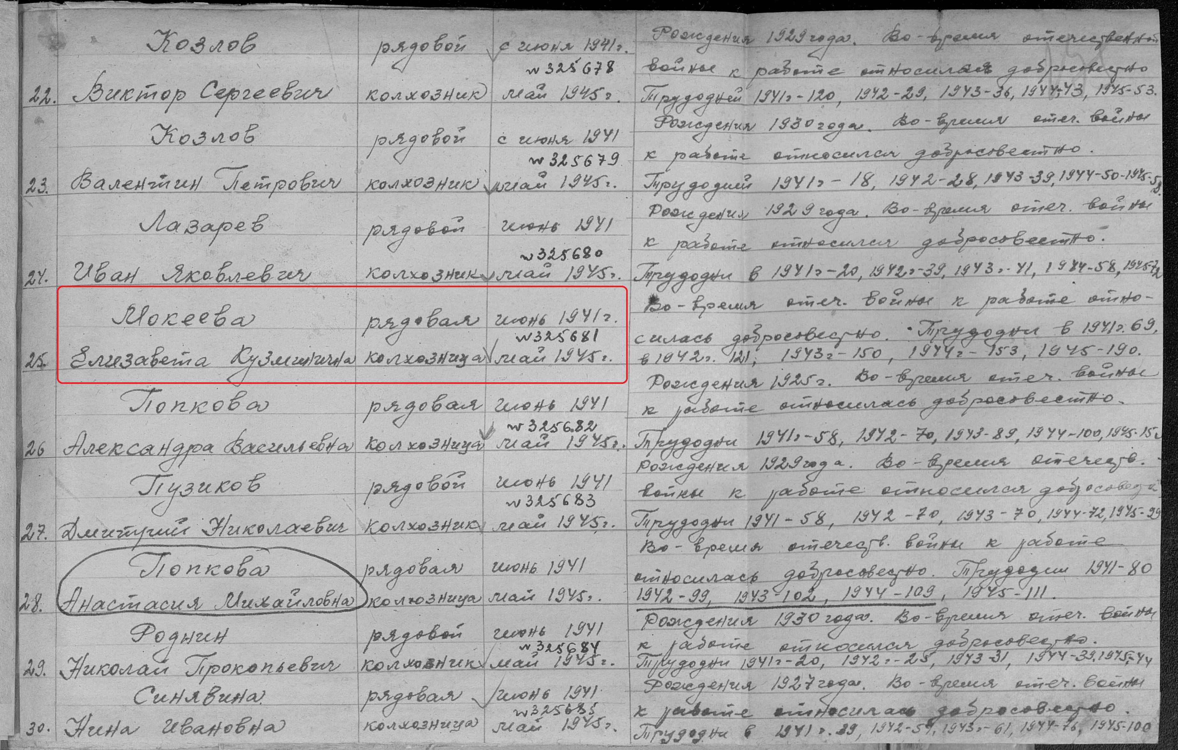 Попкова Александра Васильевна родилась в 1925 году. Место жительства: с.Новошешминск Ново-Шешминский район ТАССР. В годы Великой Отечественной войны работала в колхозе им. Чкалова рядовой колхозницей. Награждена медалью "За доблестный труд в Великой Отечественной войне 1941–1945 гг." (Акт от 01.1946 г., фонд 3610, опись 2, дело № 470, лист 175, АК № 325682).