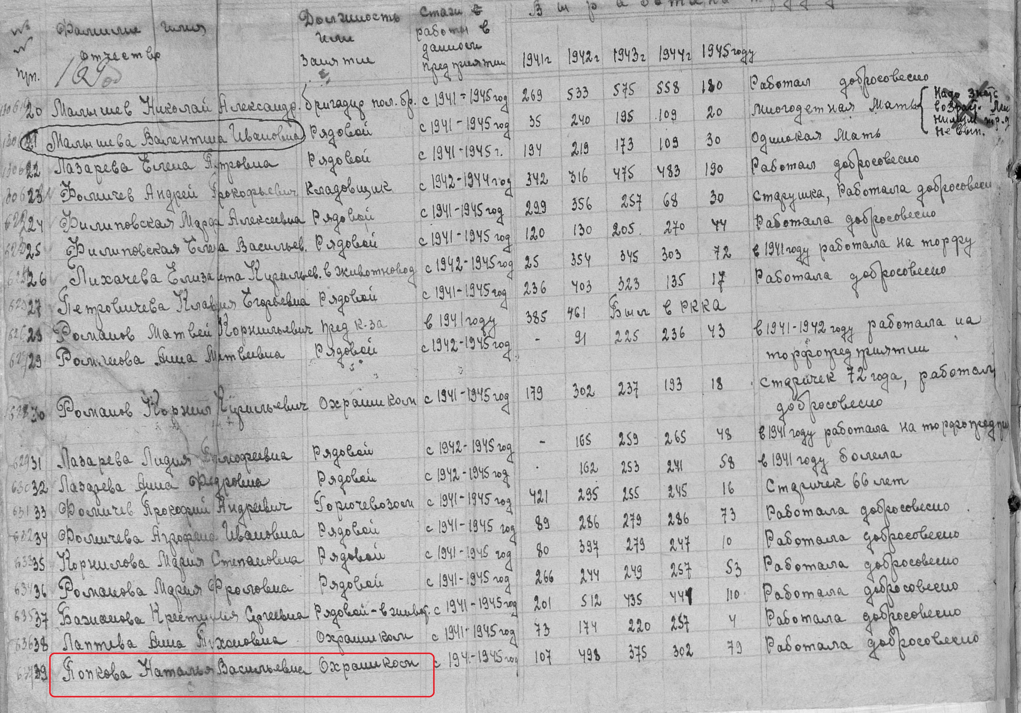 Попкова Наталья Васильевна. Место жительства: п. Сосновка Ново-Шешминский район ТАССР. В годы Великой Отечественной войны работала в колхозе им. Калинина охранницей. Награждена медалью "За доблестный труд в Великой Отечественной войне 1941–1945 гг." (Акт от 28 апреля 1947 г, фонд 3610, опись 2, дело № 325, лист 169, АК № 130639). Выбыла в 50-х годах в г. Губаха.