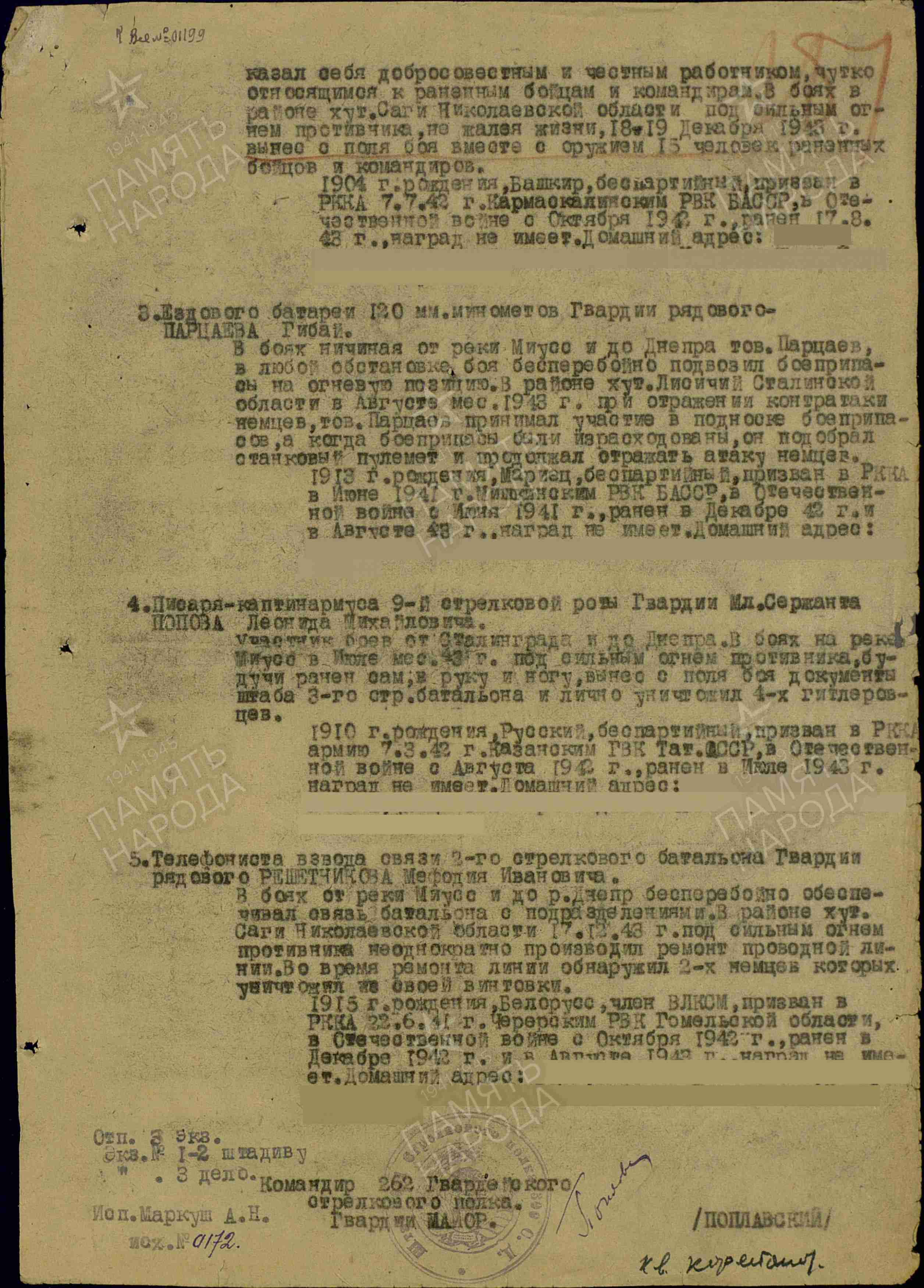 Убит 11.04.1944 г. Место захоронения: Крымская АССР, Армянский р-н, с. Карт Казак-3, западнее, 3 км, братская могила 4.