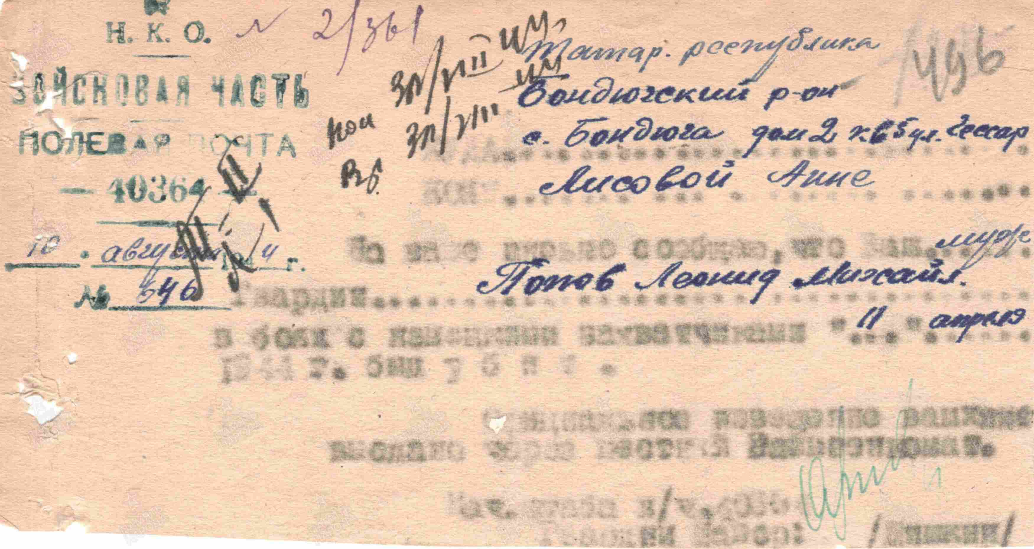На фото: Братская могила красноармейцев и советских воинов (с. Таврическое Красноперекопский район, Крым). Плита с именем Попова Л.М. Источник фото: ttps://krpero.rk.gov.ru