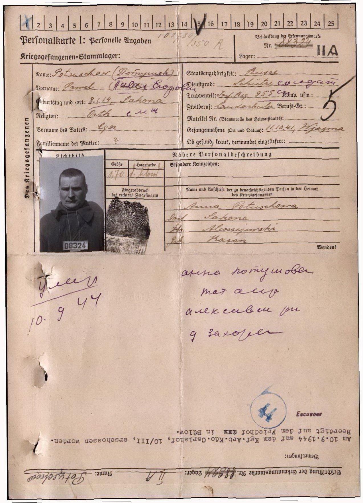 ПОТУЩЁВ Павел Егорович, 1914, с. Саконы. Мобилизован Алексеевским РВК. Красноармеец, 955 СП 309 СД 24 А Резервного фронта. Попал в плен 11 окт. 1941 в районе г. Вязьма. Умер 10 сент. 1944 в лагере II A, г. Нойбранденбург, Германия.