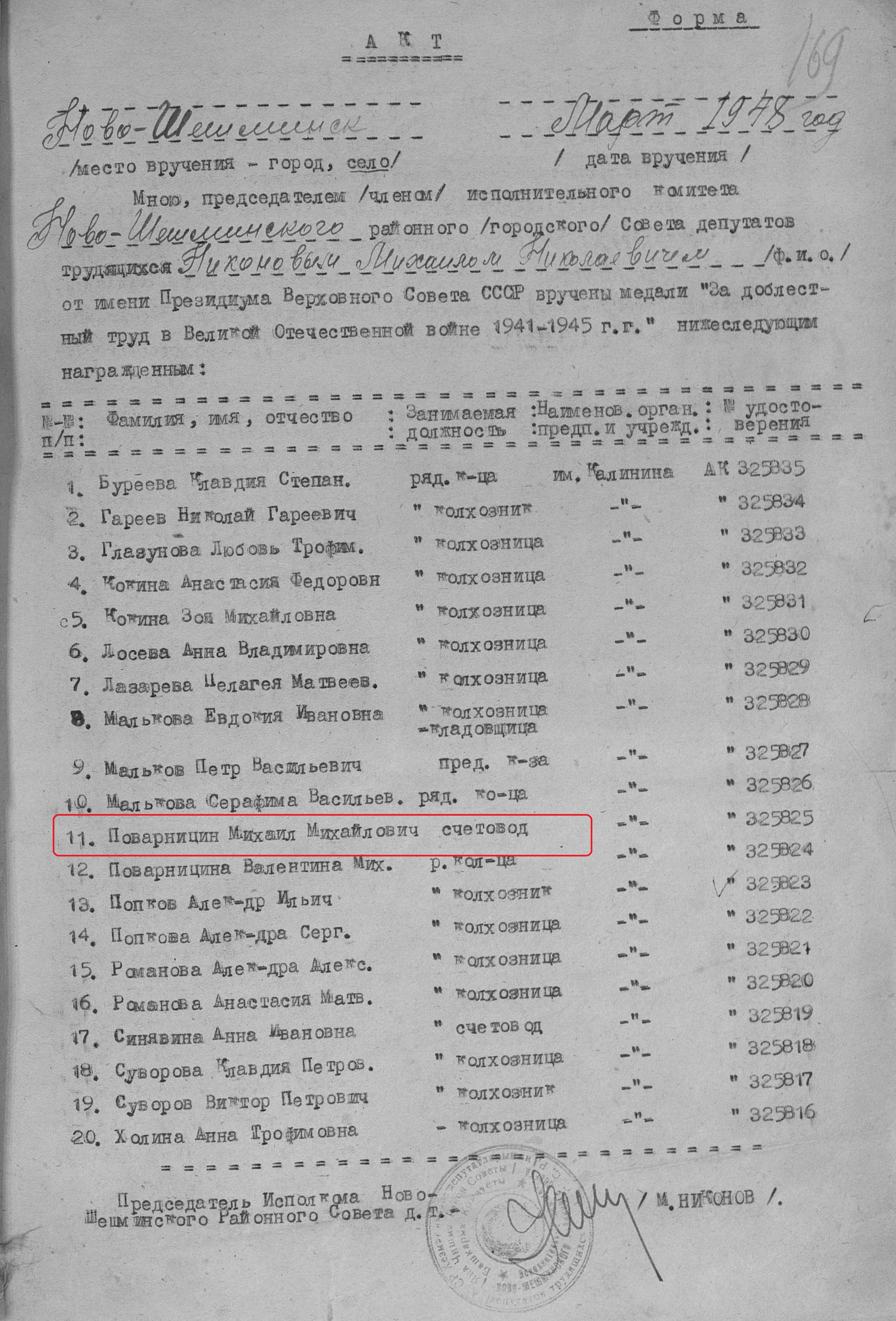 Поварницин Михаил Михайлович. Место жительства: п.Сосновка Ново-Шешминский район ТАССР. В годы Великой Отечественной войны работал в колхозе им. Калинина счетоводом. Награжден медалью "За доблестный труд в Великой Отечественной войне 1941–1945 гг." (Акт от 03.1948 г.,фонд 3610, опись 2, дело № 470, лист 169, № 325825).