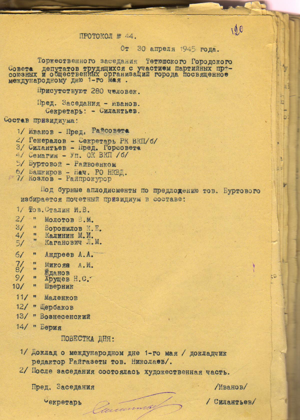 Главная > ПРОТОКОЛ № 44 ТОРЖЕСТВЕННОГО ЗАСЕДАНИЯ ТЕТЮШСКОГО ГОРОДСКОГО СОВЕТА ДЕПУТАТОВ ТРУДЯЩИХСЯ ОТ 30 АПРЕЛЯ 1945 ГОДА, ПОСВЯЩЕННЫЙ МЕЖДУНАРОДНОМУ ДНЮ 1- ГО МАЯ.