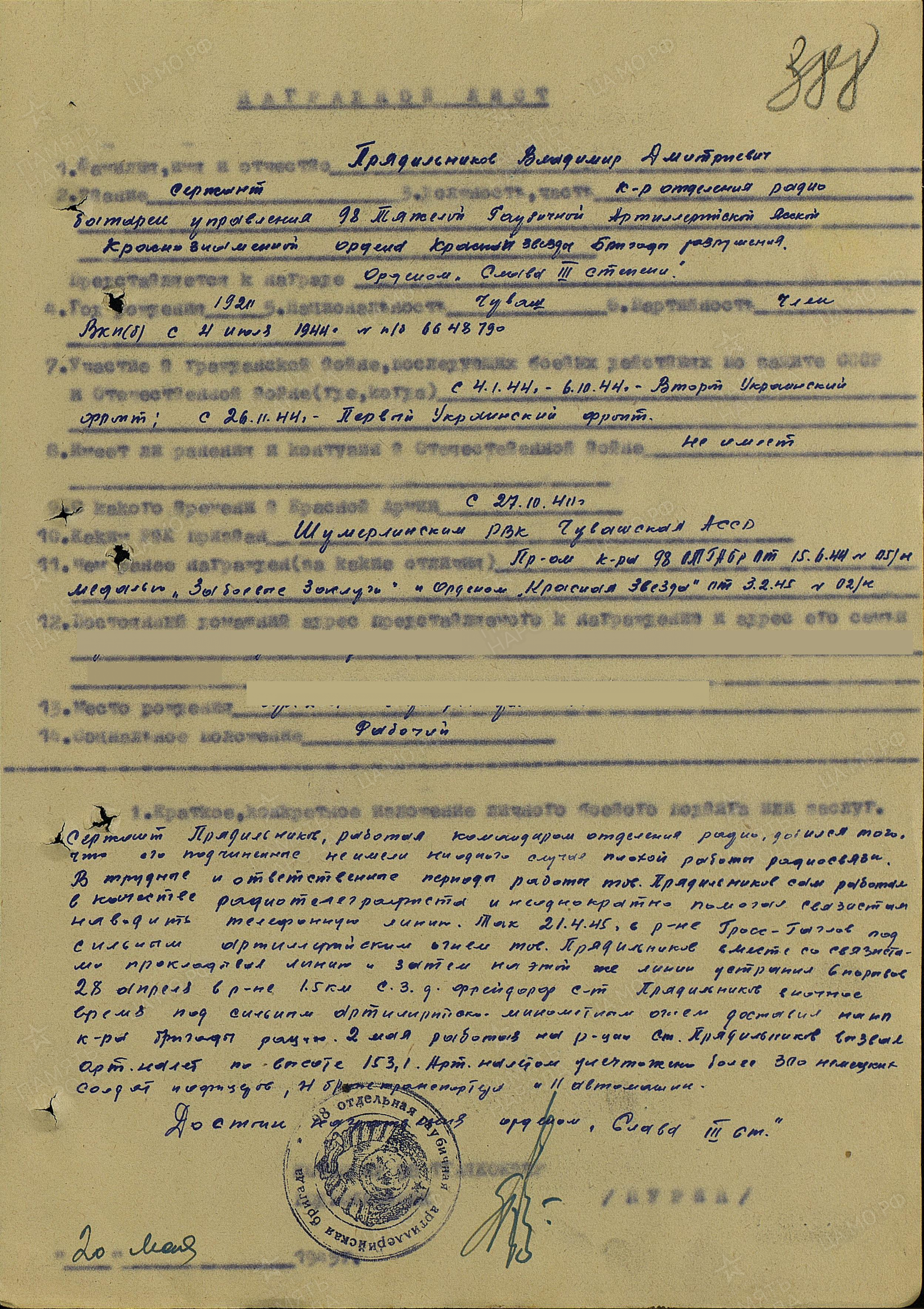 ПРЯДИЛЬНИКОВ Владимир Дмитриевич, 1920, д. Алешкино, Неверкинский р-н, Пензенская обл. Член ВКП(б). Мобилизован Шумерлинским РВК ЧувАССР в 1940. На фронте с 4 янв. 1944. Сержант, ком. радиоотделения батареи управления 98 отд. тяжёлой ГАБр разрушения РГК 1 гв. АД прорыва в составе 1 и 2 УкрФ. Многократно в ходе боёв, под огнём противника, исправлял неработающие радиоприёмники, доставлял рации на командные и наблюдательные пункты, всегда поддерживая устойчивую радиосвязь между ком. бригады, штабом и дивизионами. Работал радиотелеграфистом, линейным связистом. 21 апр. 1945 устранил под обстрелом шесть порывов линии связи. 2 мая 1945 вызвал арт. огонь по высоте 153,1, в результате уничтожено более 30 солдат и офицеров противника, четыре бронетранспортёра и 11 автомашин. Награждён медалью «За боевые заслуги», орденами Красной Звезды, Славы 3 ст. Отечественной войны 2 ст. (1985). Последние годы жил в п. Алексеевское. Скончался в 2012, похоронен в п.г.т. Алексеевское.