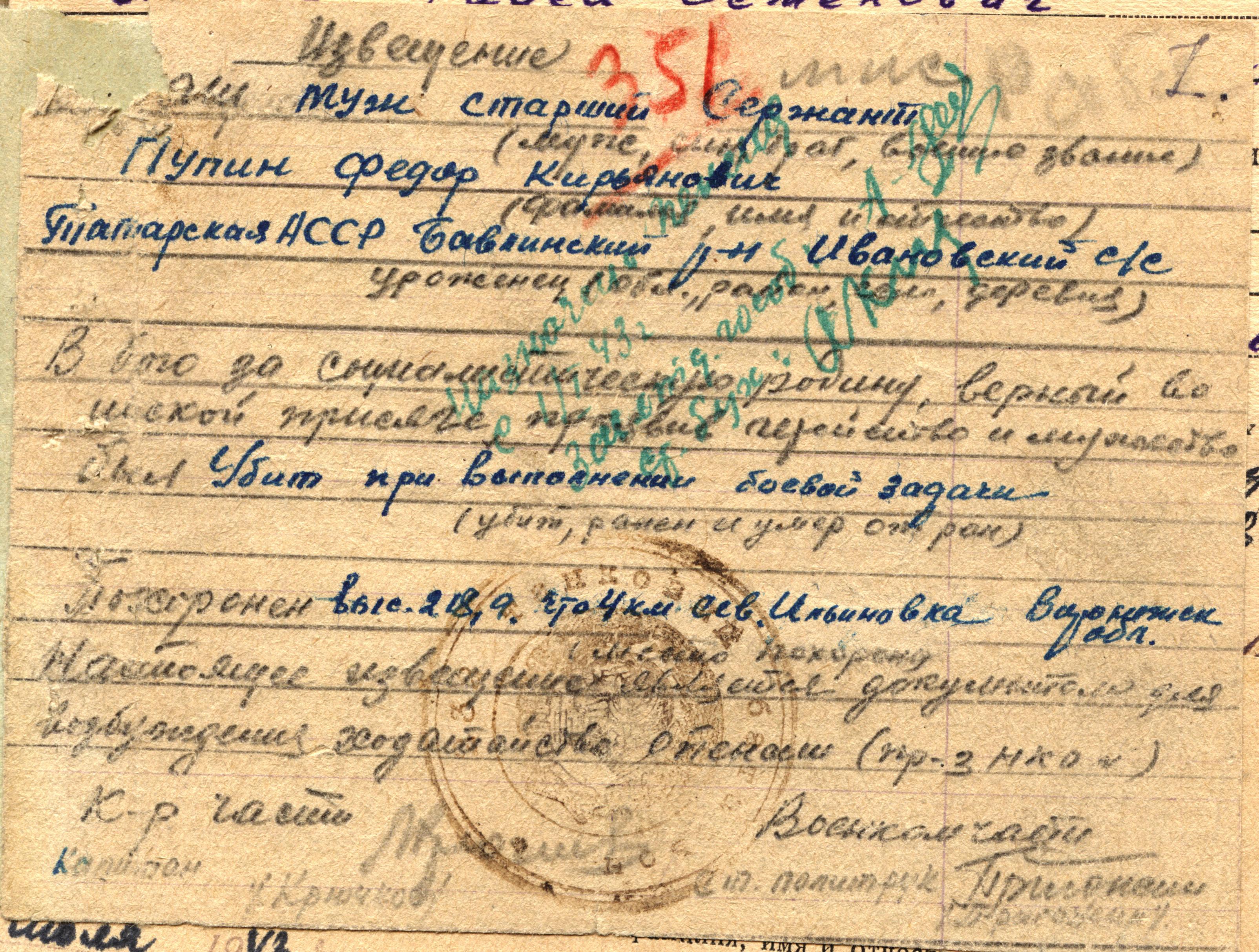 Родился в селе Ивановка Бавлинского района ТатАССР. Жене Наталье Никифоровне Пупиной пришло извещение о гибели её мужа - старшего сержанта, механика - водителя танка Т- 32 86 танковой бригады. Убит 16 августа 1942 года.