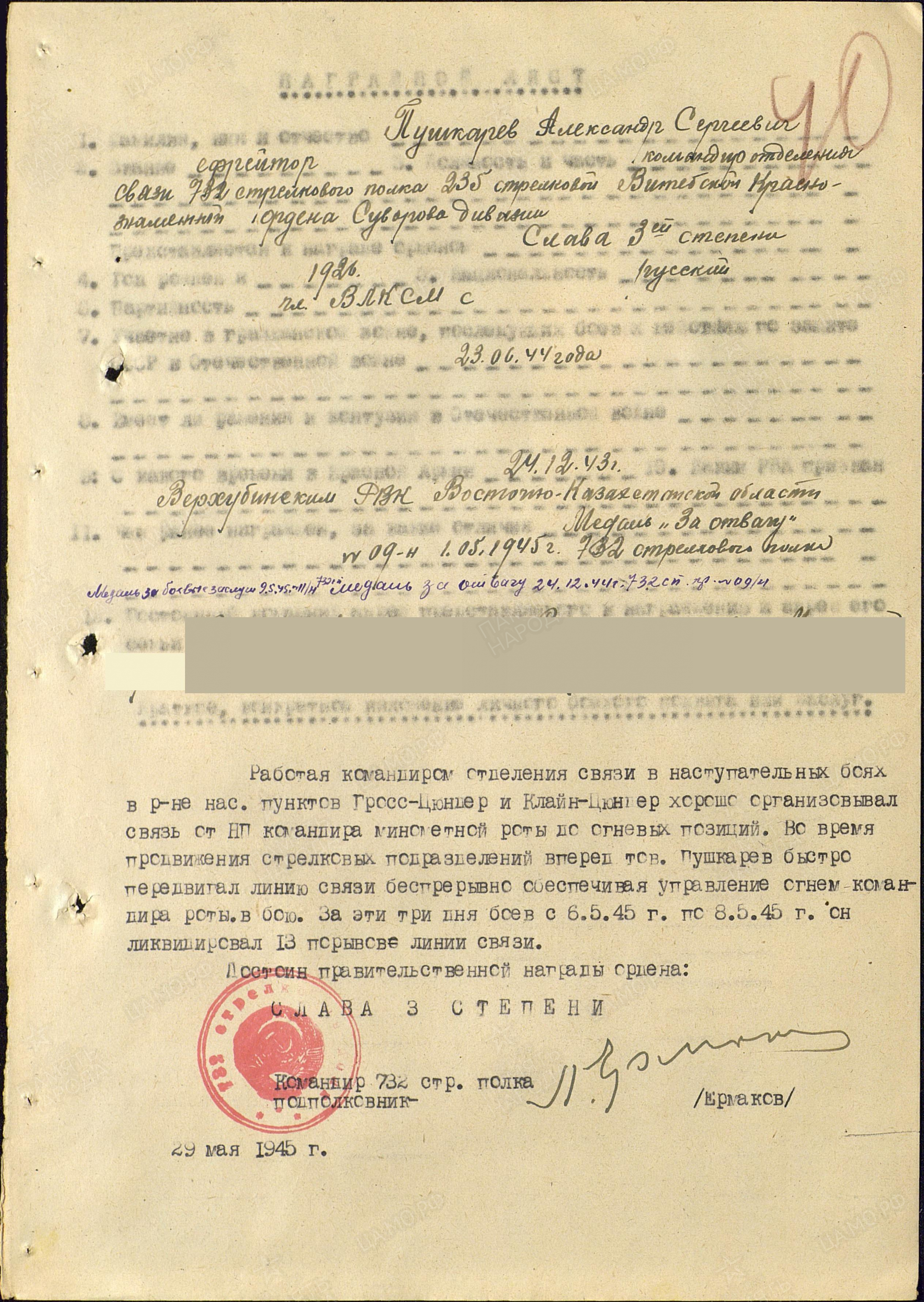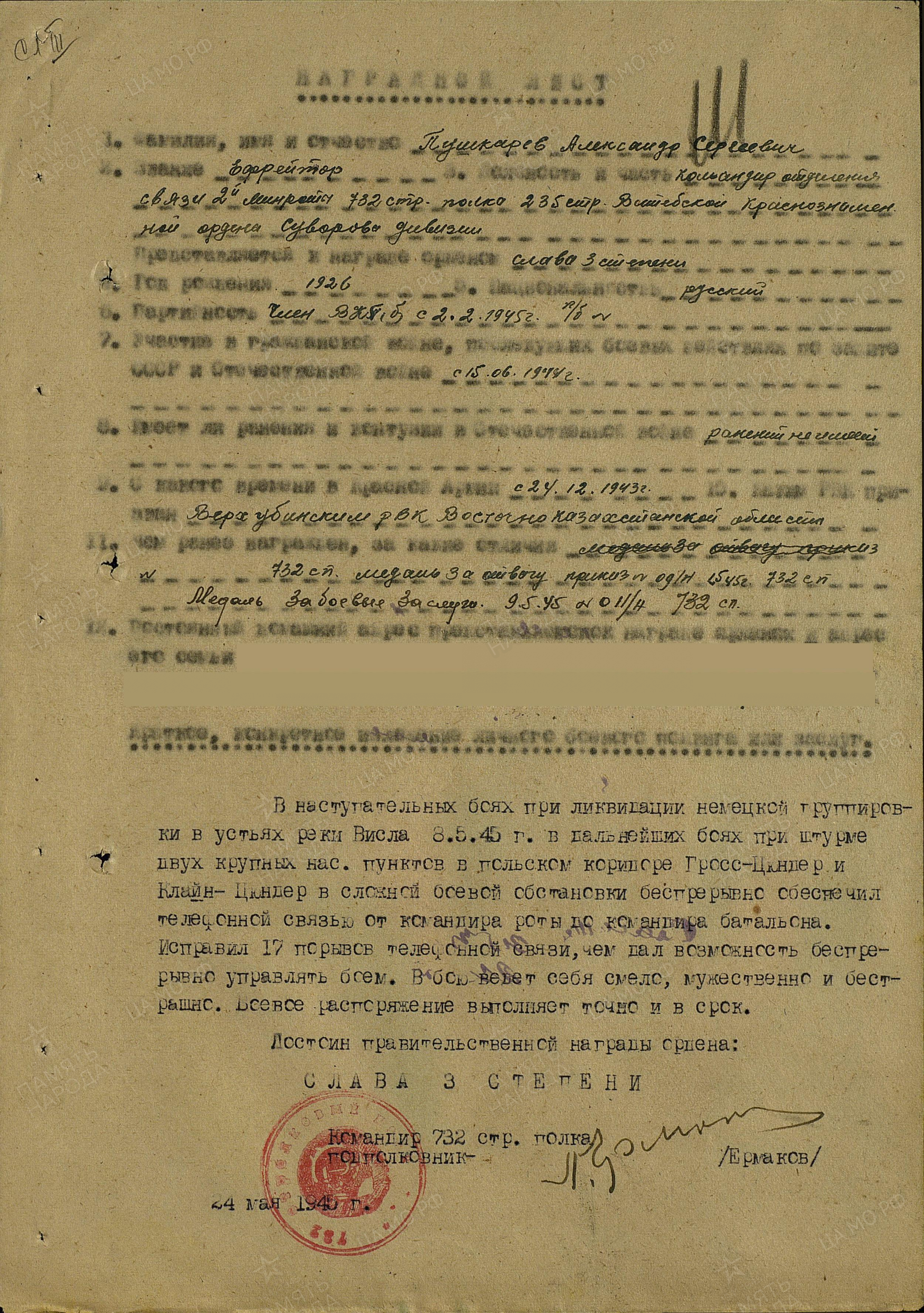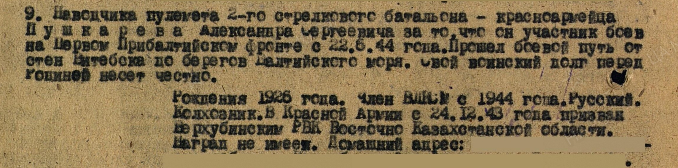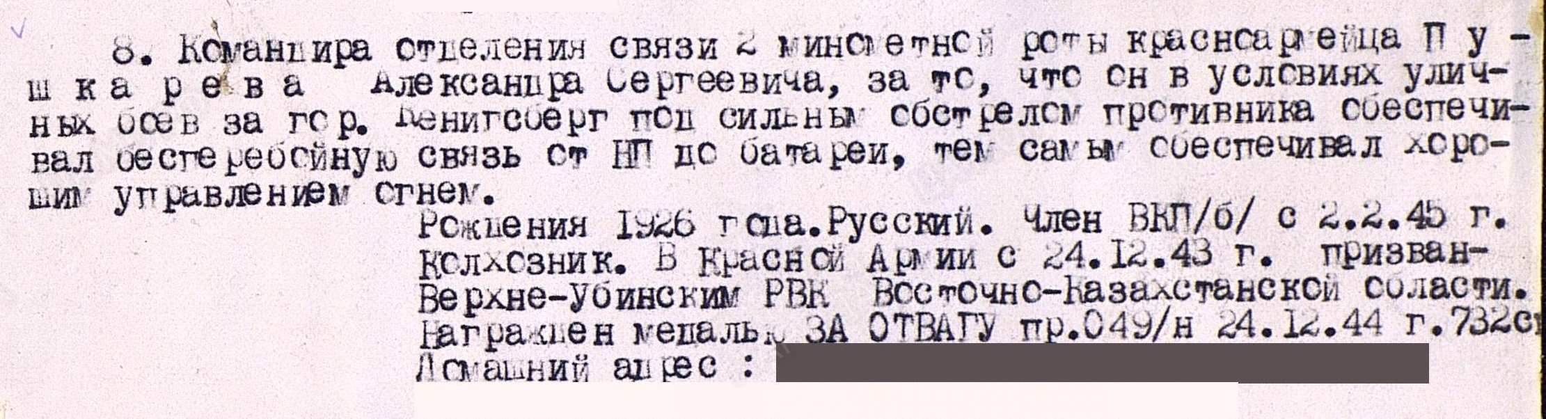 ПУШКАРЁВ Александр Сергеевич, 1926, с. Билярск. Мобилизован Верхне-Убинским РВК Восточно-Казахстанской обл. КазССР 24 дек. 1943. Член ВЛКСМ. Ефрейтор, наводчик пулемёта, ком. отделения связи мин. роты 732 СП 235 СД 43 А 1 ПрибФ и 39 А 3 и 2 БелФ. Участвовал в освобождении Белоруссии и Польши, штурме Кёнигсберга. В боях за устье р. Висла обеспечивал телефонной связью ком. роты с ком. батальона. Устранил 30 порывов связи. Награждён двумя медалями «За отвагу», медалями «За боевые заслуги», «За взятие Кёнигсберга», орденами Красной Звезды, Славы 3 ст., Отечественной войны 2 ст. (1985).