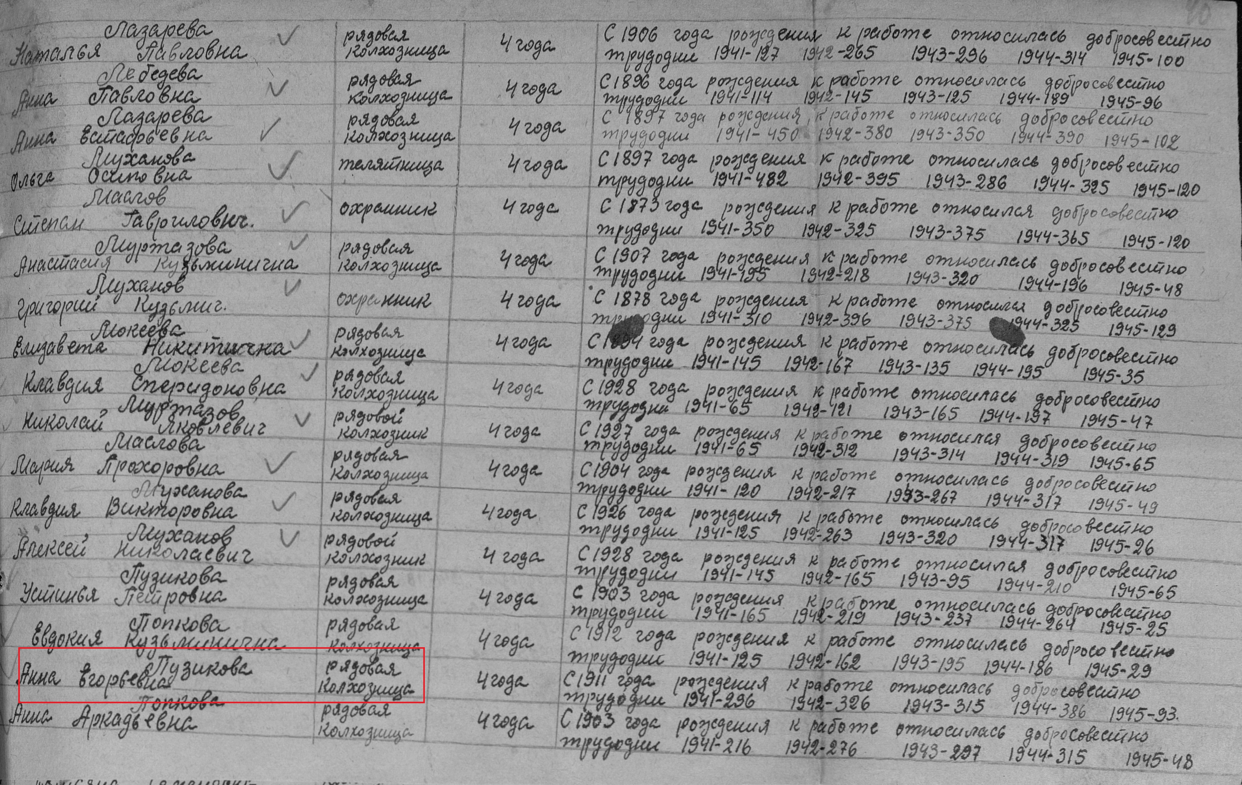 Пузикова Анна Егорьевна родилась в 1911 году. Место жительства: с.Новошешминск Ново-Шешминский район ТАССР. В годы Великой Отечественной войны работала в колхозе им. Чкалова рядовой колхозницей. Награждена медалью "За доблестный труд в Великой Отечественной войне 1941–1945 гг." (Акт от 01.1946 г., фонд 3610, опись 2, дело № 325, лист 40).