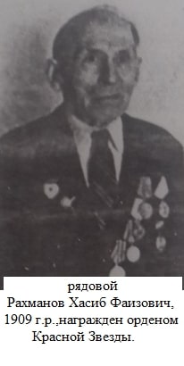 РАХМА́НОВ Хасыб (Хасый, Хасыйб) Фаизович (24.06.1909, с.Старый Юмралы Тетюшского у. Казан. губ., ныне Апастовского р-на РТ — ?), участник Вел. Отеч. войны. Окончил педагогический институт (1937), до войны работал учителем в Алькеевском р-не ТАССР. В Кр. Армии с 29 декабря 1941, призван Алькеевским РВК ТАССР. Воевал с марта 1942 на 1-ом Украинском и 1-ом Белорусском фронтах. Гвардии сержант, телефонист телефонно-кабельной роты 153-го отдельного гвардейского Прикарпатского батальона связи 11-го гвардейского танкового Прикарпатского корпуса. Под интенсивным артиллерийско-миномётным огнём противника установил 16 августа 1944 осевую линию связи для 44-й и 45-й танковых бригад и обслуживал её до 19 августа, оперативно исправляя повреждения и обеспечивая бесперебойную связь командиру корпуса. В наступательных боях с 13 января по 5 февраля 1945, при прорыве обороны противника на Висленском плацдарме, обеспечил бесперебойной связью наблюдательный пункт командира корпуса с командными пунктами 44-й танковой и 27-й мотострелк. бригад, при этом быстро устраняя повреждения. Во время наводки связи через р.Варта причинённые артиллерией противника порывы устранял в течение нескольких минут. После войны работал учителем истории, позже несколько лет директором Алпаровской средней школы; заведовал отделом народного образования Алькеевского р-на ТАССР. Награждён орденом Красной Звезды (1945), медалями «За отвагу» (1943), «За боевые заслуги» (1944), «За взятие Берлина» (1945).