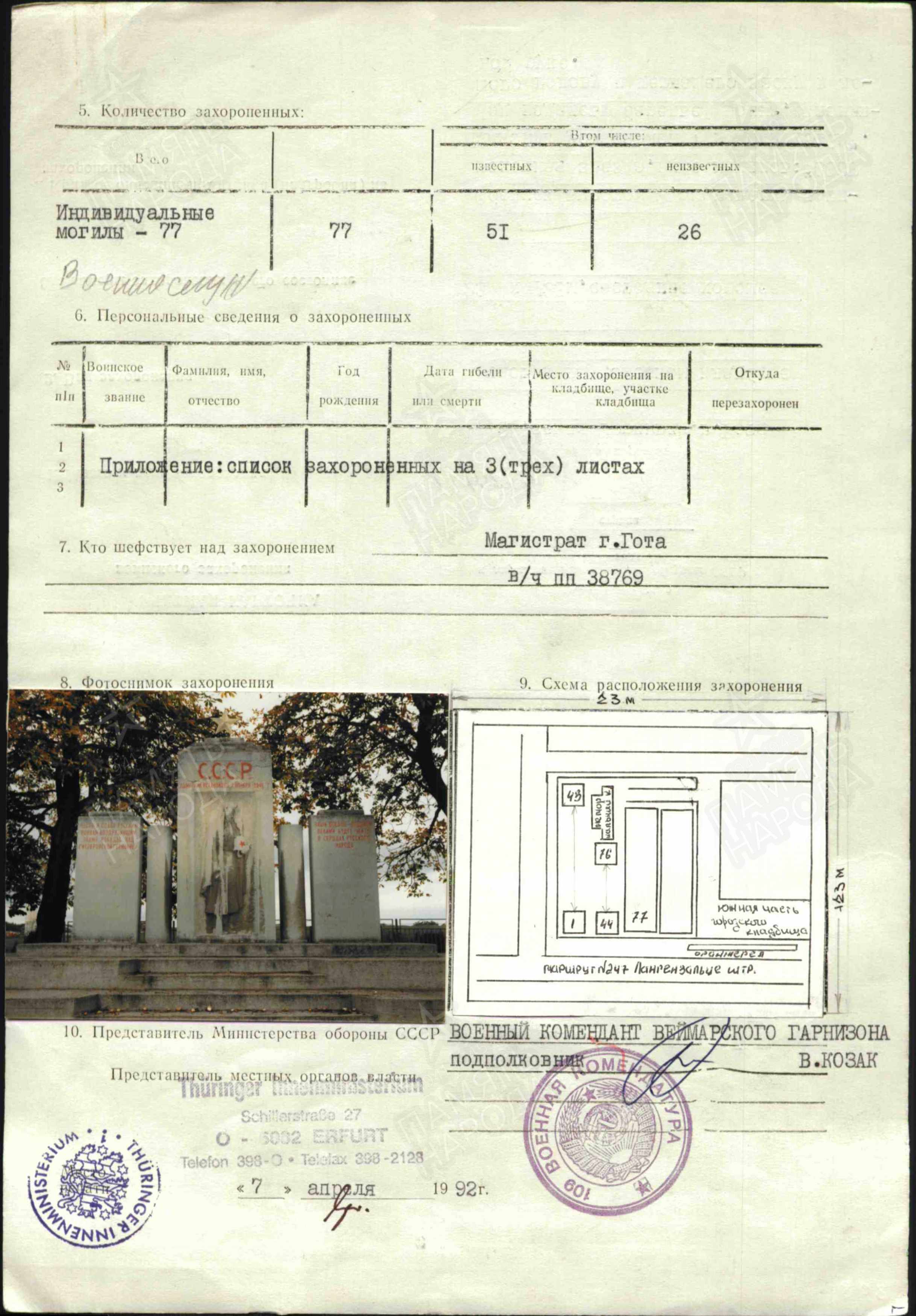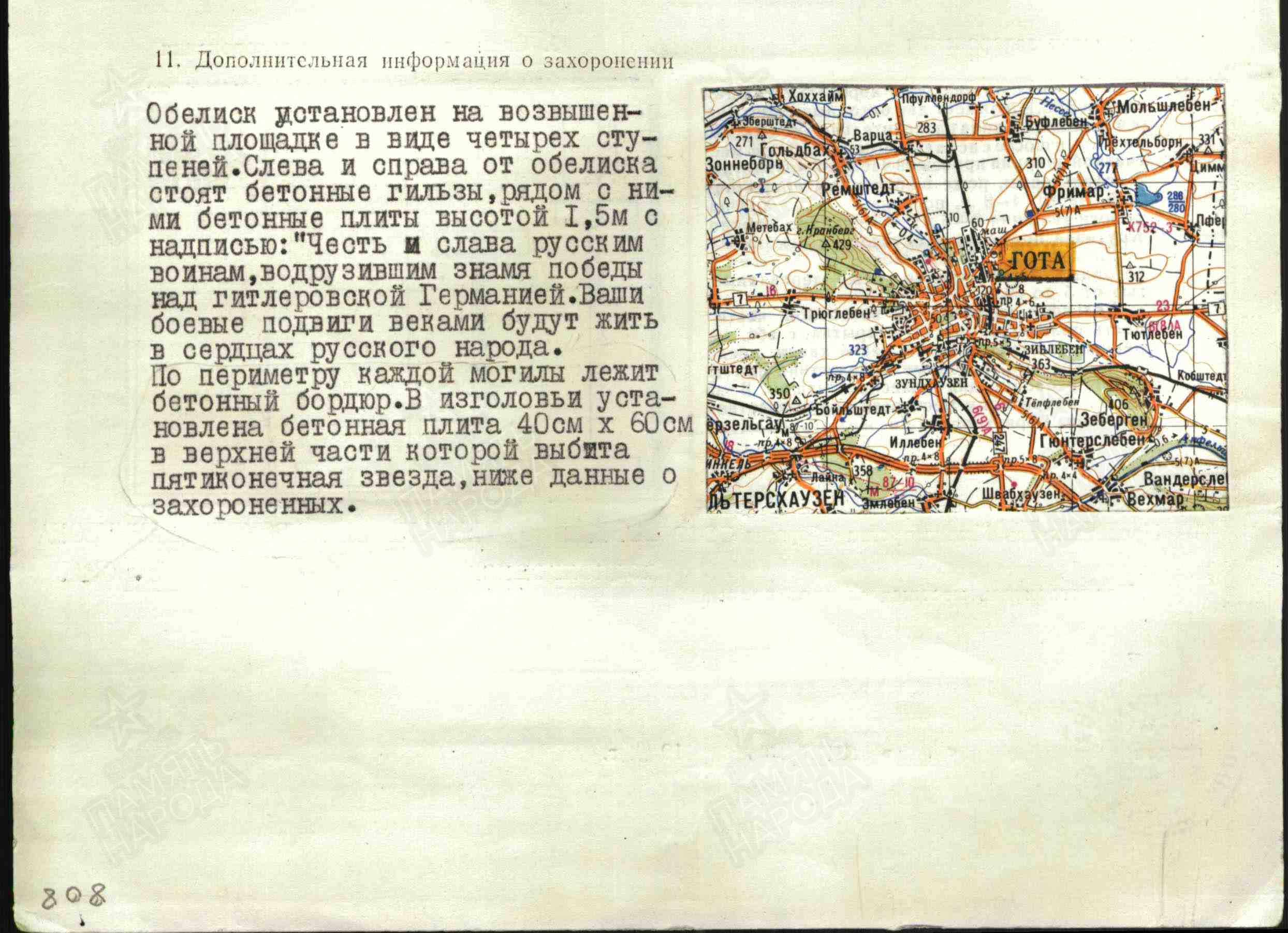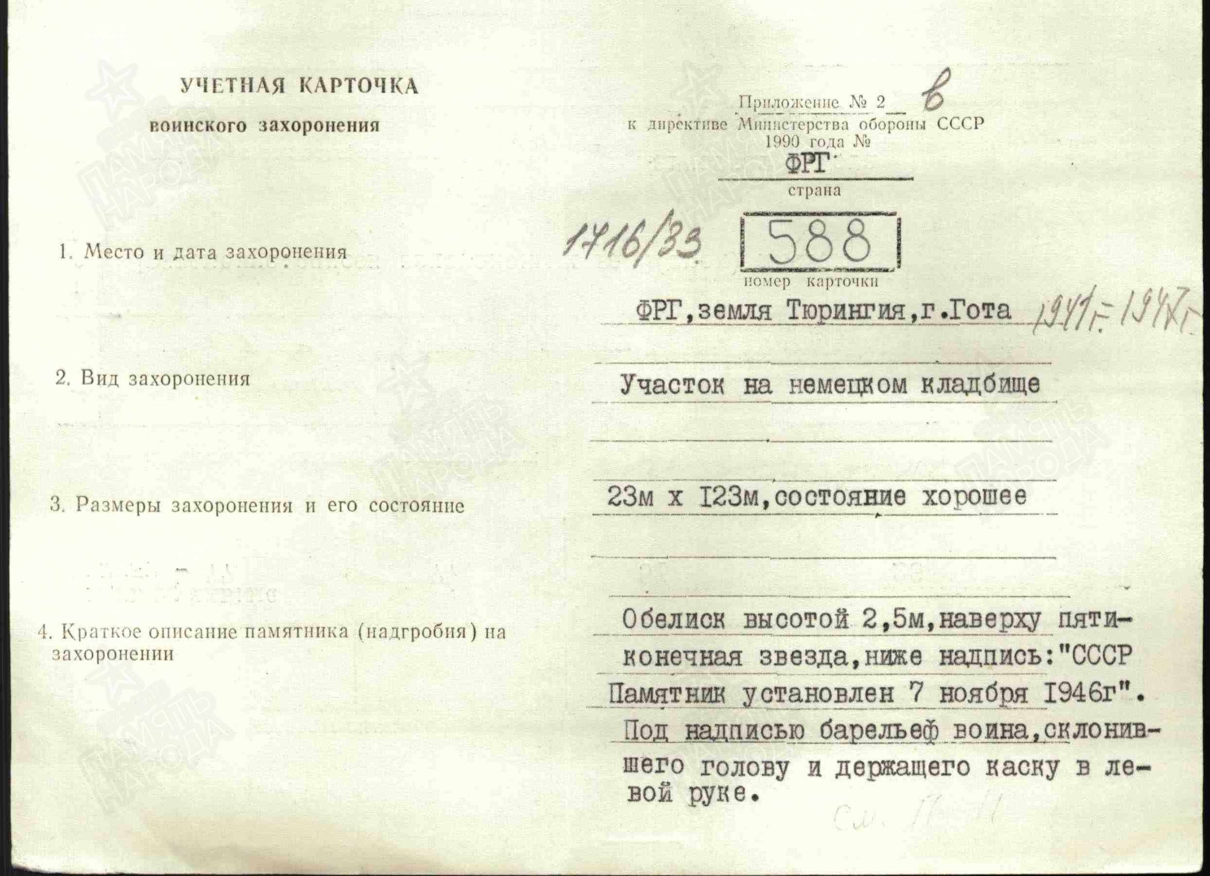 Место захоронения Германия, земля Тюрингия, Эрфуртский округ, Готский р-н, г. Гота, кладбище Могила: 59. Захоронение: 250000809.