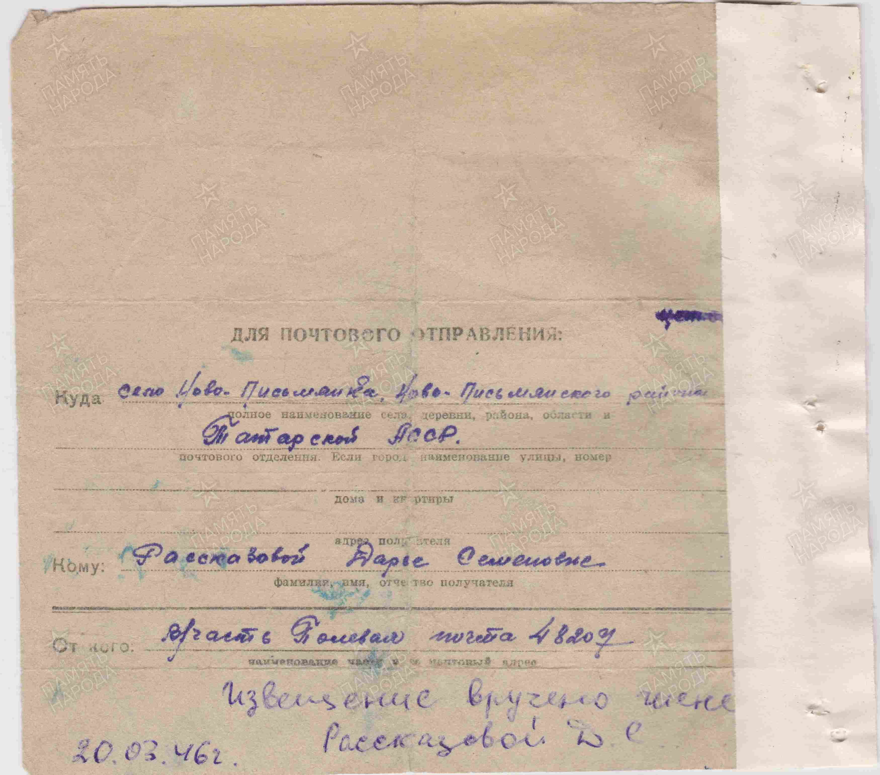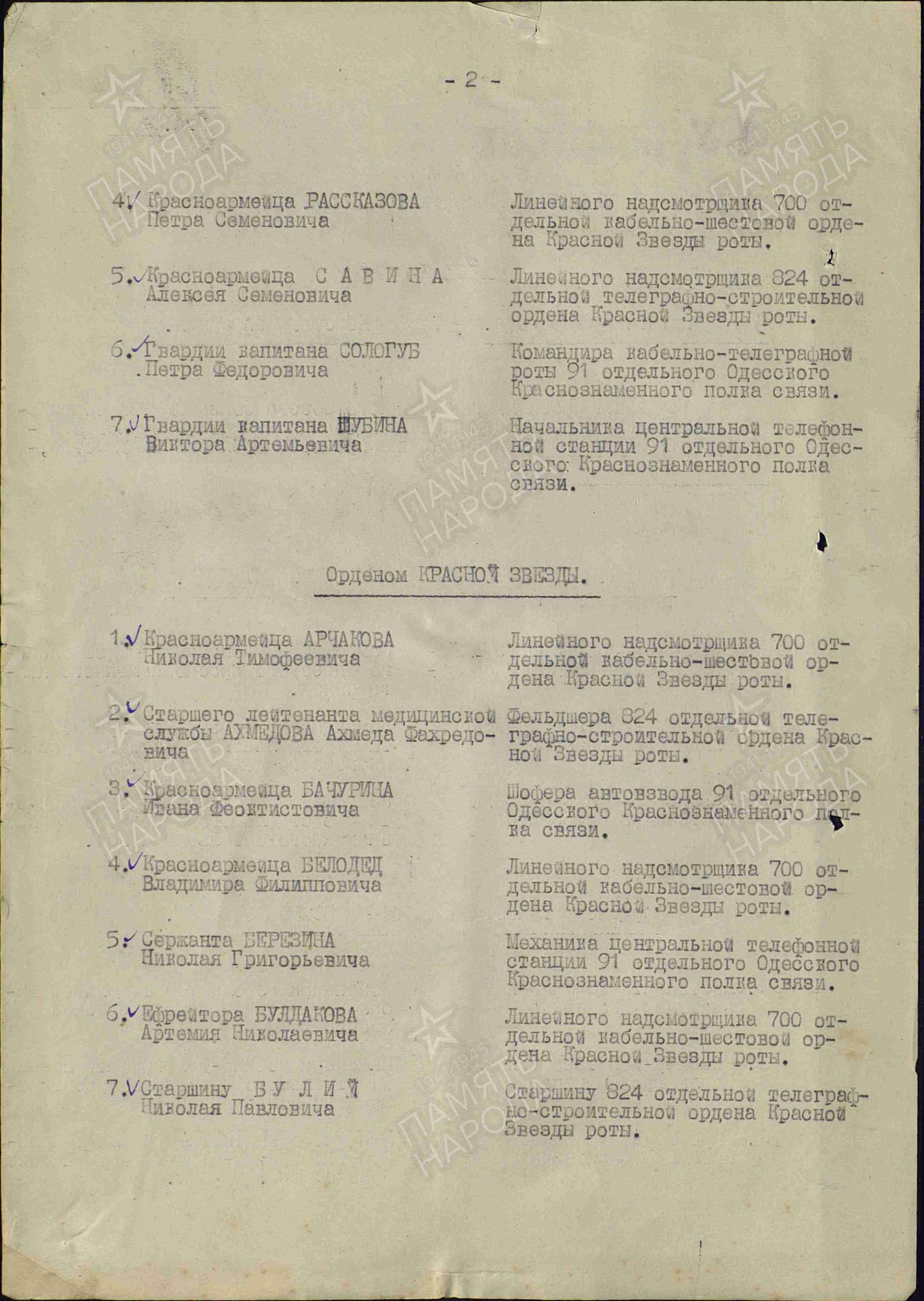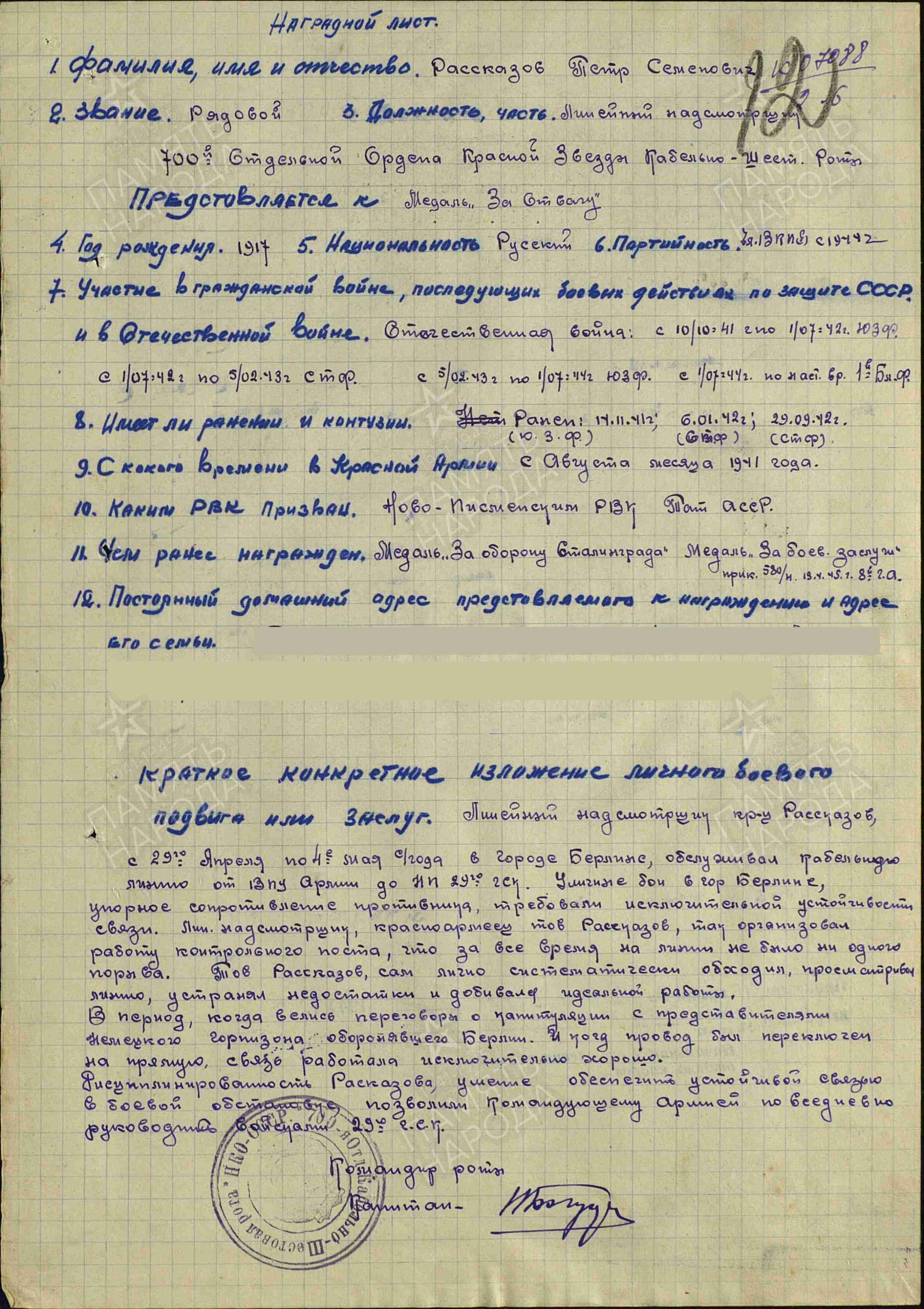 «…Линейный надсмотрщик красноармеец Рассказов П.С. с 29-го апреля по 4 мая 1945г. в городе Берлине, обслуживал кабельную линию от ВПУ Армии до НП 29 ГСУ. Уличные бои в г. Берлине, упорное сопротивление противника, требовали исключительной устойчивости связи. Лин. Надсмотрщик, красноармеец тов. Рассказов, так организовал работу контрольного поста, что за все время на линии не было ни одного порыва. Тов. Рассказов, сам лично систематически обходил, просматривал линию, устранял недостатки и добивался идеальной работы.